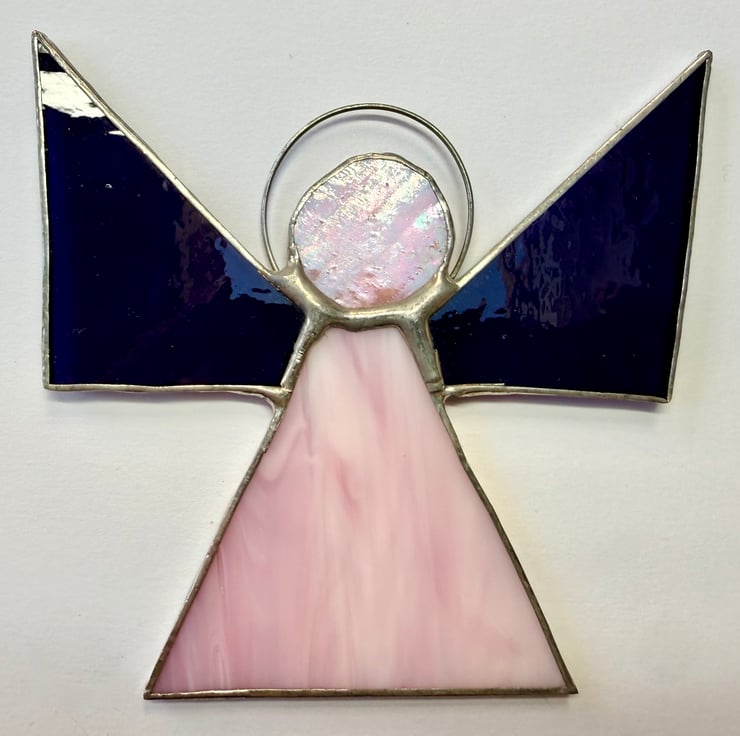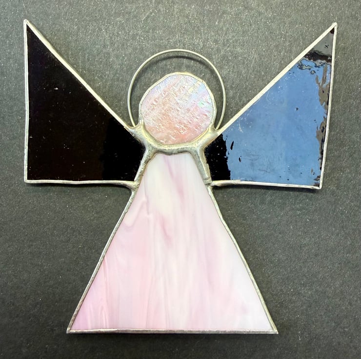 Each piece is hand cut, edged with copper foil, and soldered using the traditional Tiffany method. The finished angel measures approximately 10 cm high by 10.5 cm wide, including the halo.