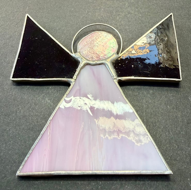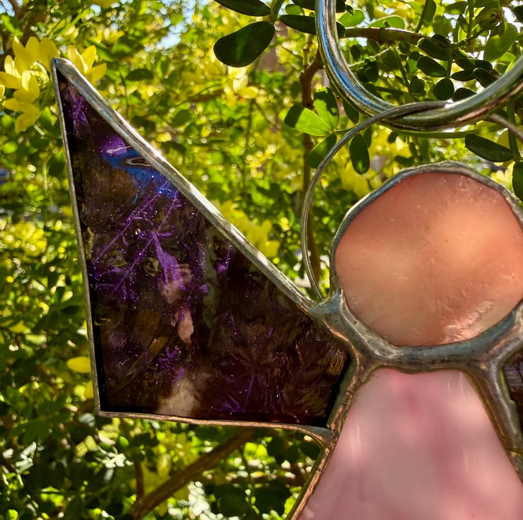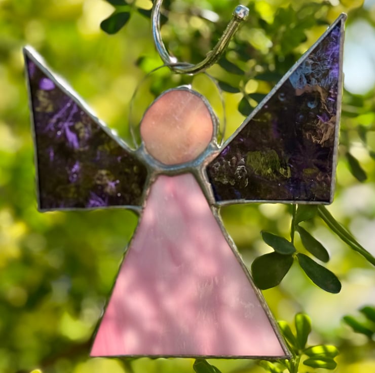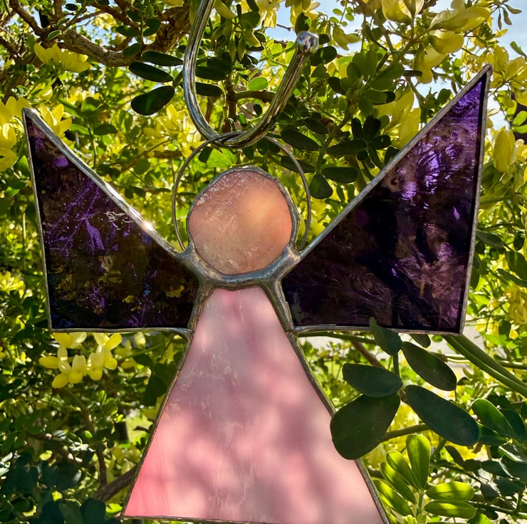 This hand crafted stained glass angel features a soft pale pink triangular body with gentle natural variations that give it a calm, soothing glow. The wings are made from beautiful purple gluechip glass — the frosted, feathery texture adds a wonderfully wing like quality, catching the light in delicate patterns. A deeper orangey pink circular head completes the design, topped with a simple halo from which the angel hangs.