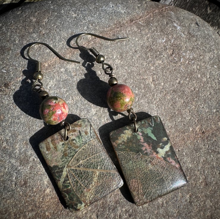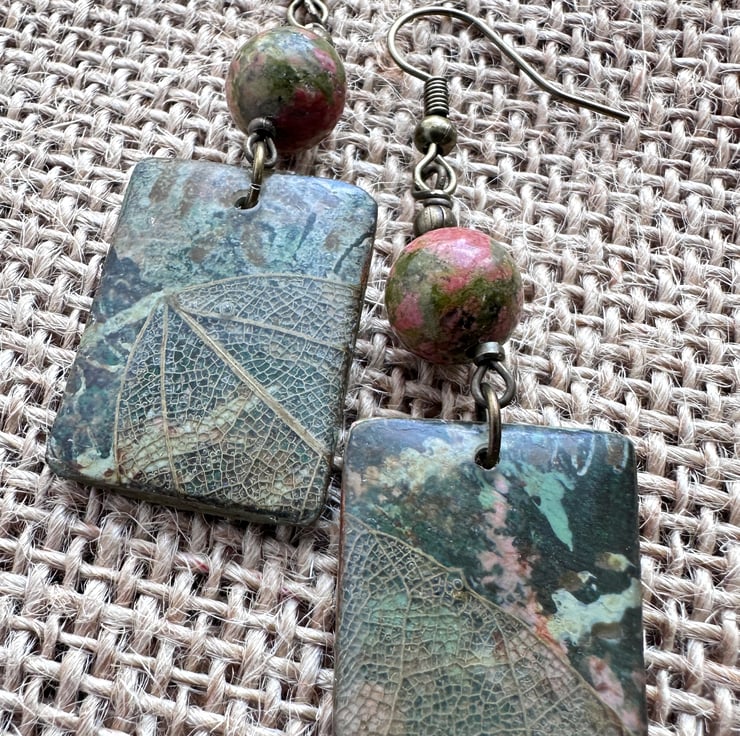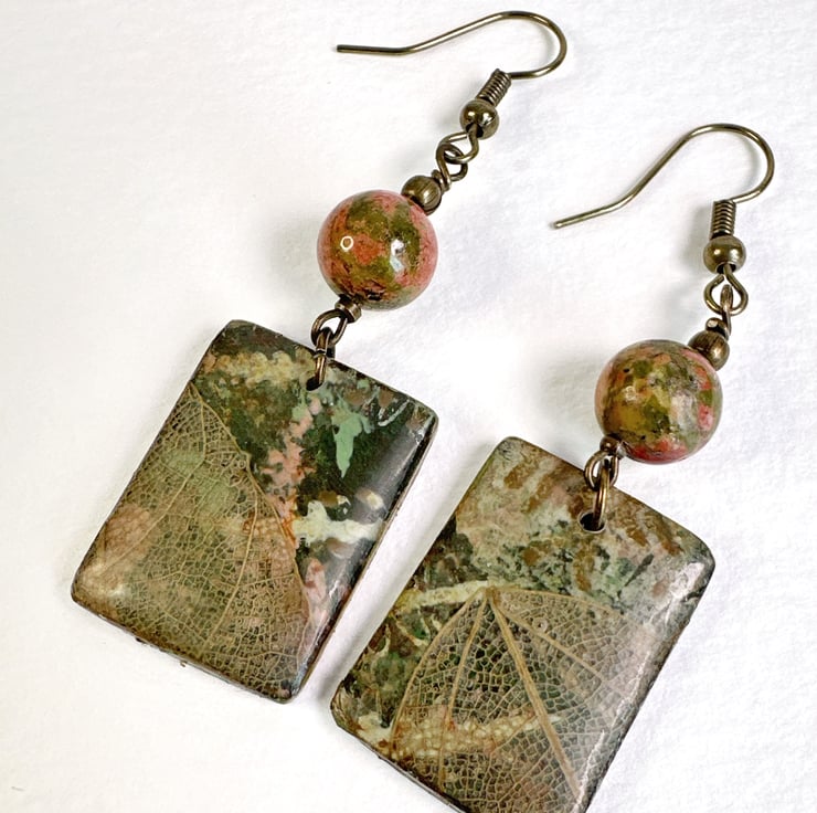 This pair features a section of a skeletal leaf and the design is complimented by the colours of Unakite Semi Precious Beads. Brass Plated, Nickel Free, Ear Hooks.