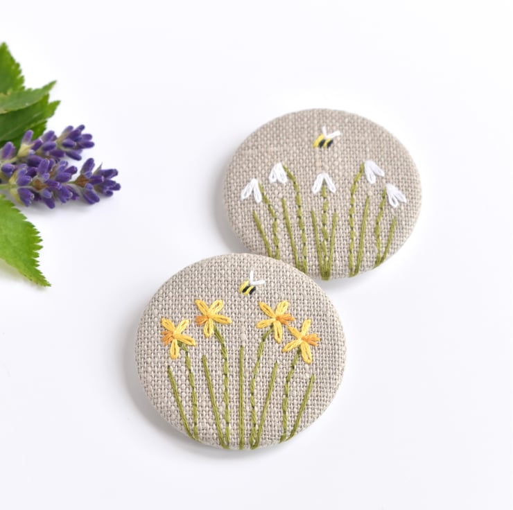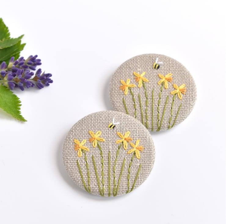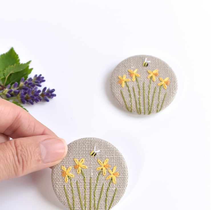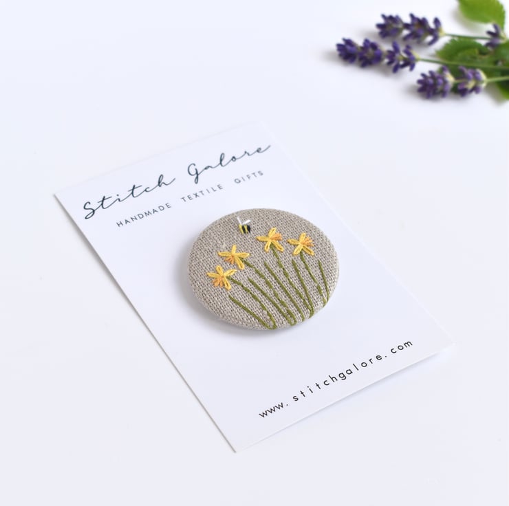 This simple but elegant embroidered daffodil badge is made from natural linen fabric. The daffodils and small bee are all delicately hand sewn.