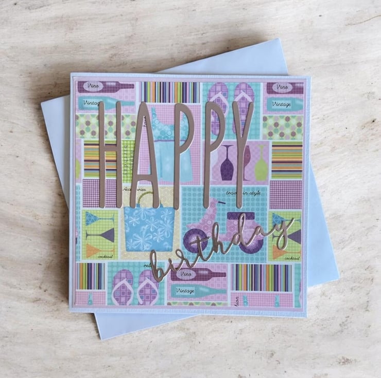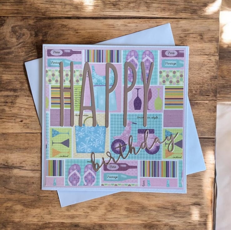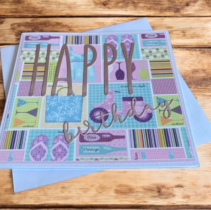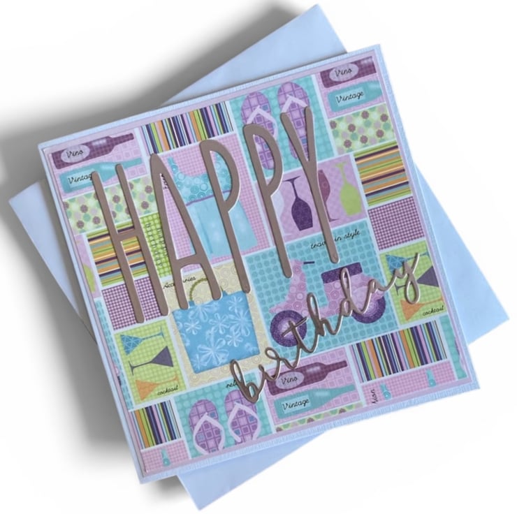 Celebrate someone special with this vibrant, handmade birthday card featuring a playful patchwork of pastel patterns and stylish cocktail-inspired designs.