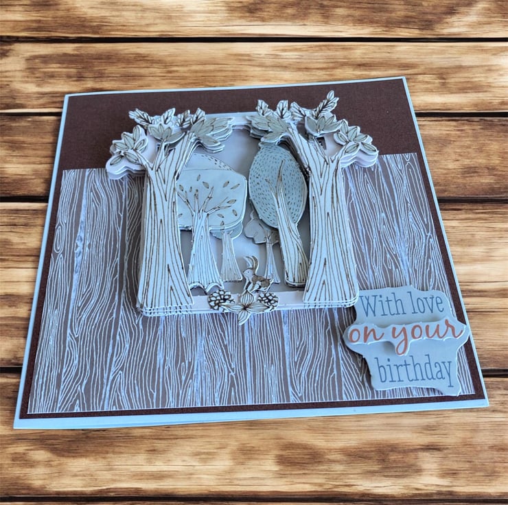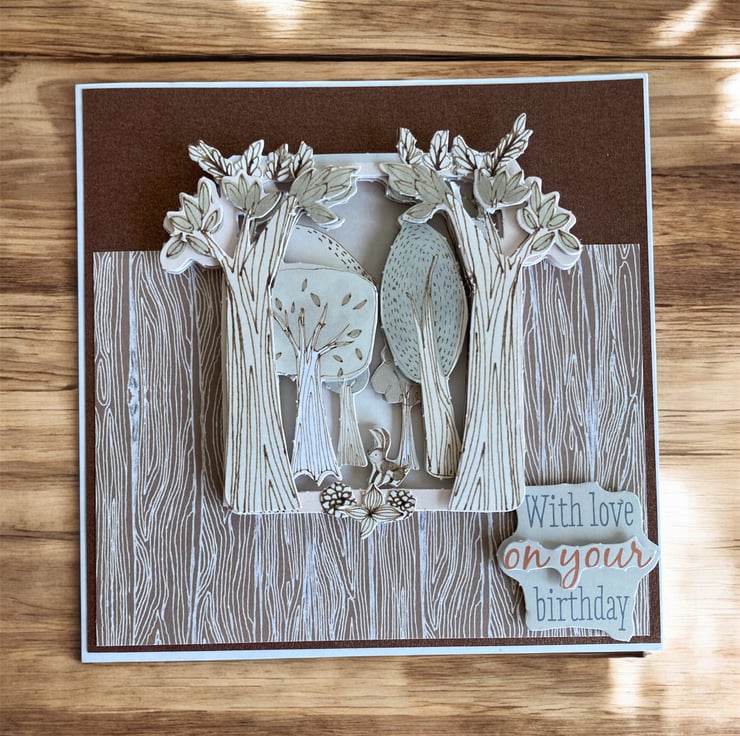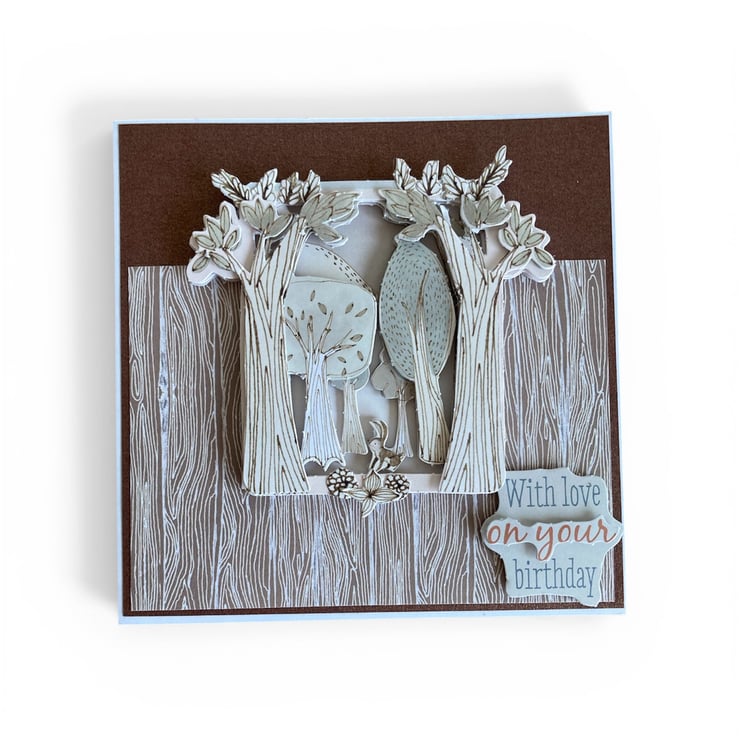 Bring a touch of the outdoors to someone’s special day with this beautifully handcrafted 5x5 inch layered woodland birthday card.