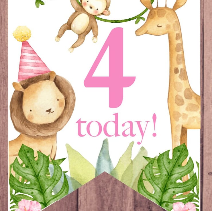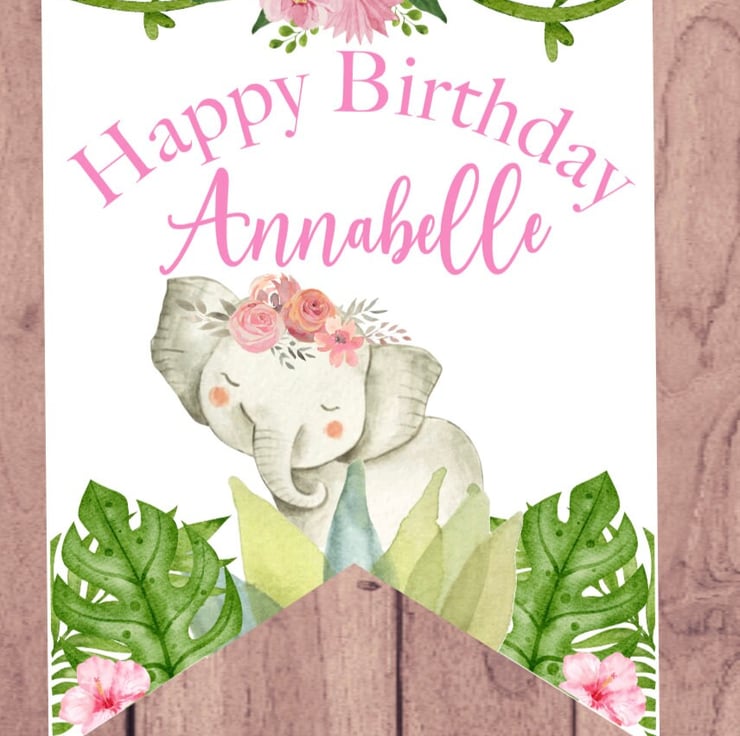 This fun bunting features a beautiful watercolour illustration of jungle animals & tropical leaves. The text is in a matching pink in a mix of cursive & bold writing.
