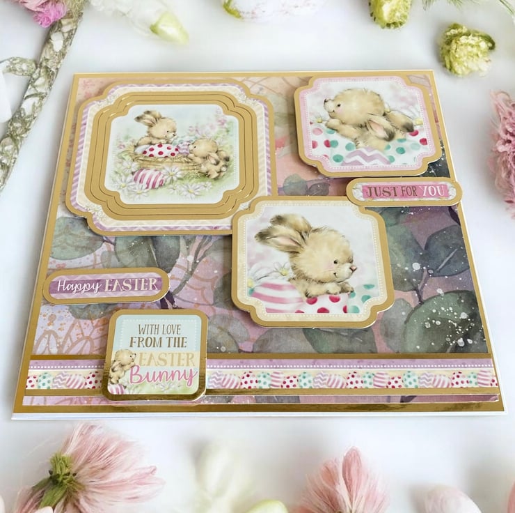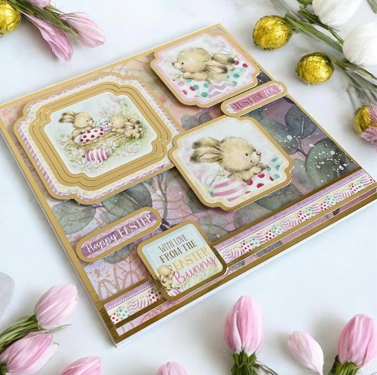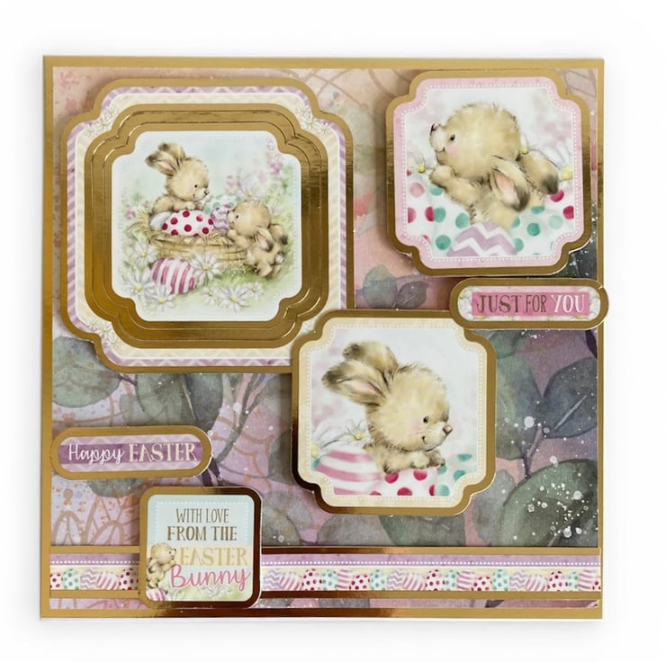 This card features a charming, nostalgic illustration of fluffy bunnies and decorated eggs, brought to life with intricate 3D decoupage layering. Every element is layered to create a wonderful sense of depth.