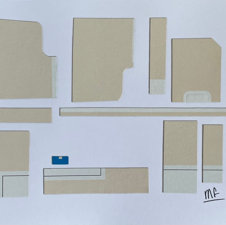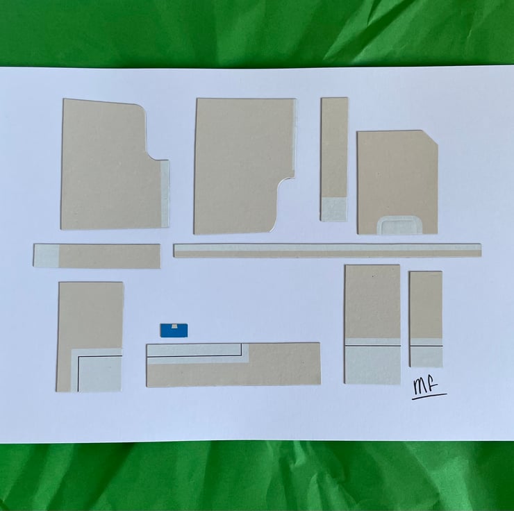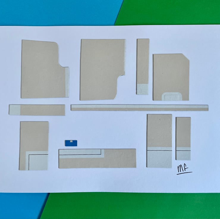Materials: white card 300gsm; water-based glue; upcycled colour-printed card