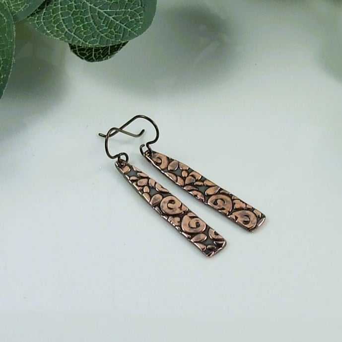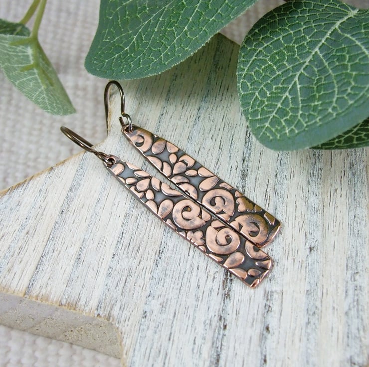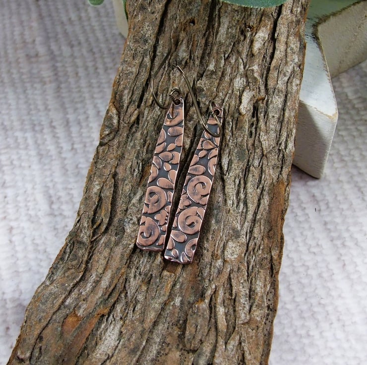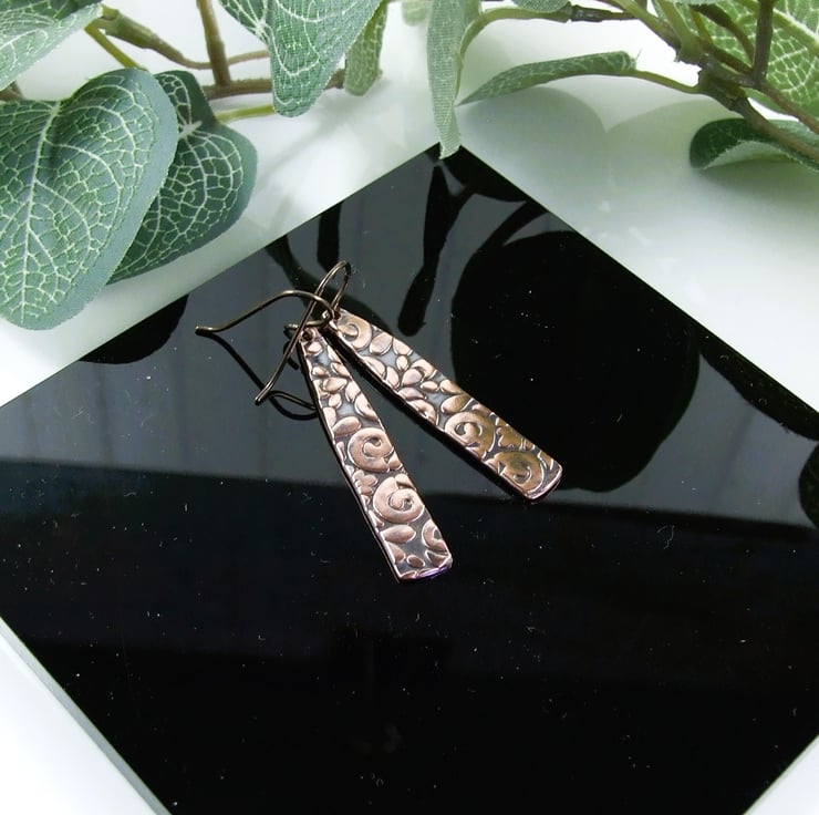 Copper bar dropper earrings with embossed pattern oxidised finish and hypoallergenic niobium ear wires.