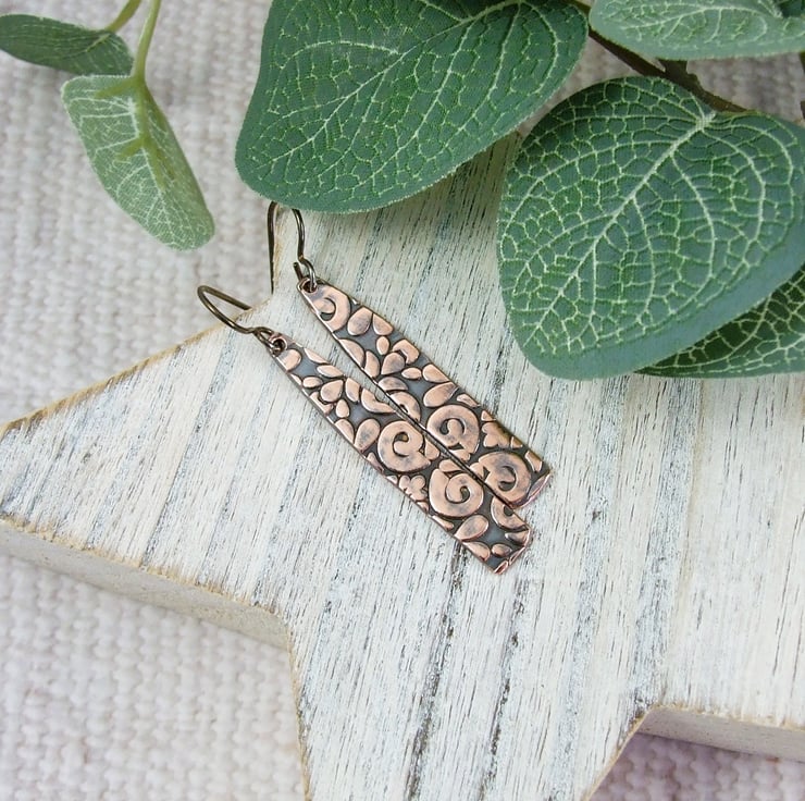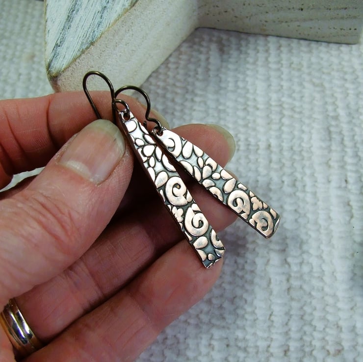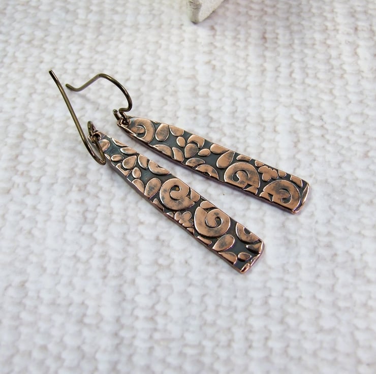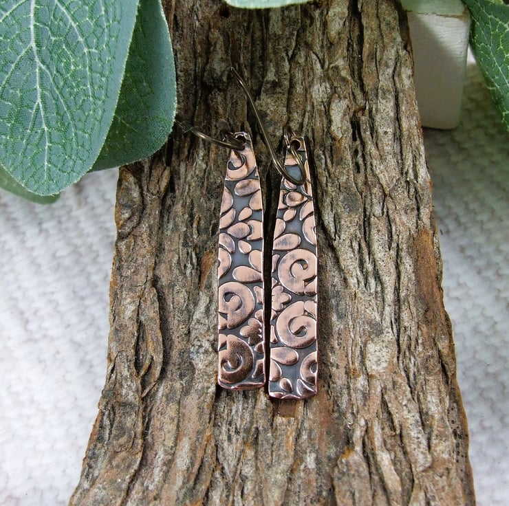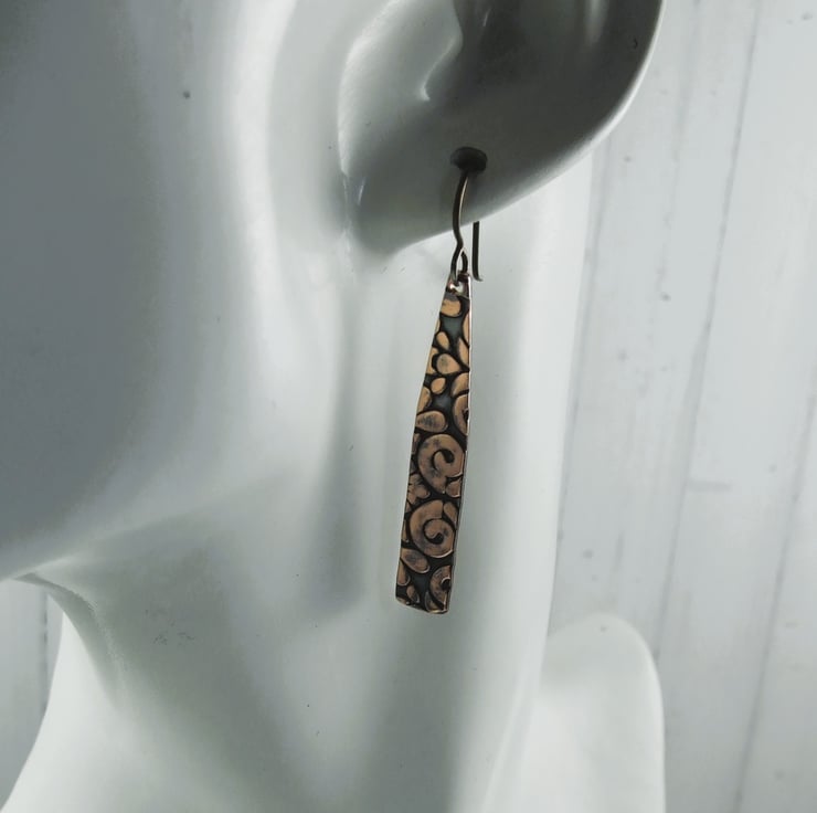 I have created the bar shapes from copper sheet, hand cut and embossed with a pattern. I then oxidised and added some hypoallergenic bronze niobium ear wires.
