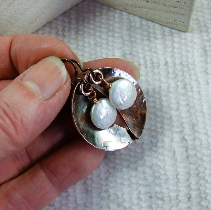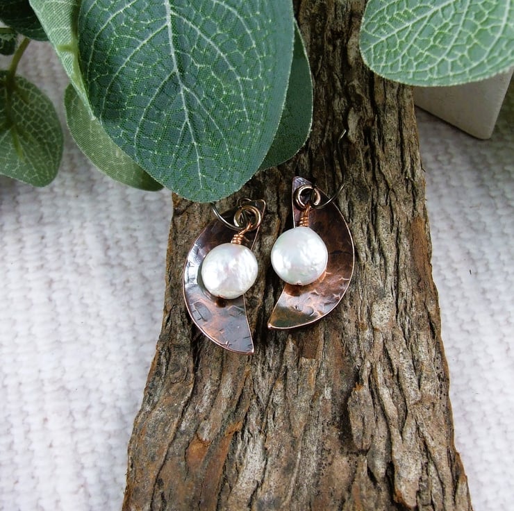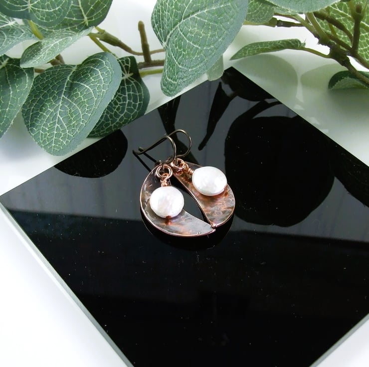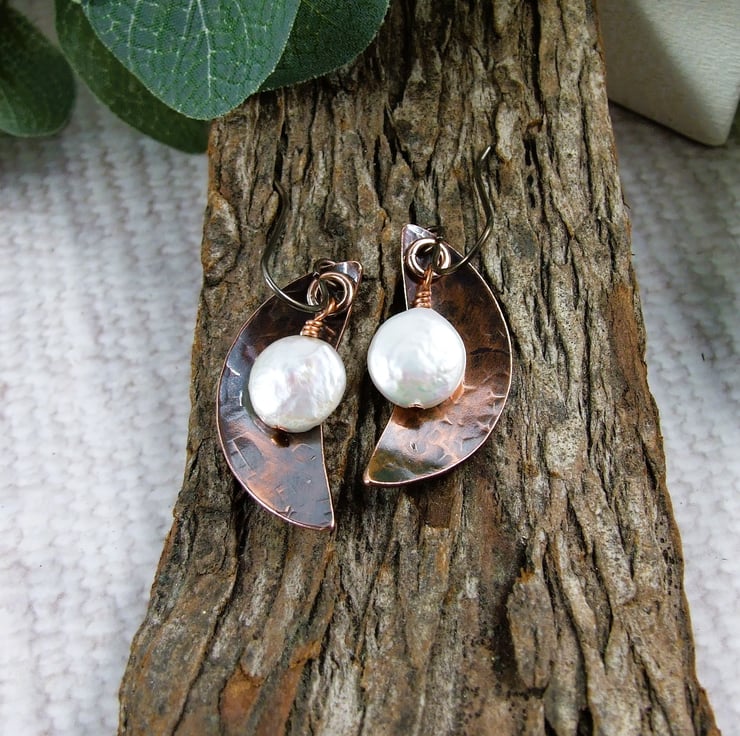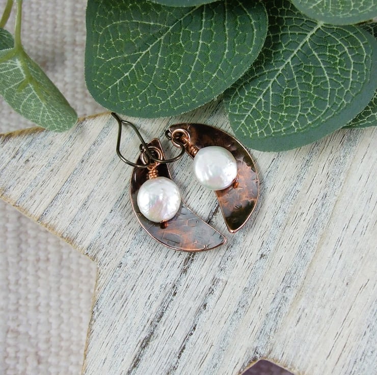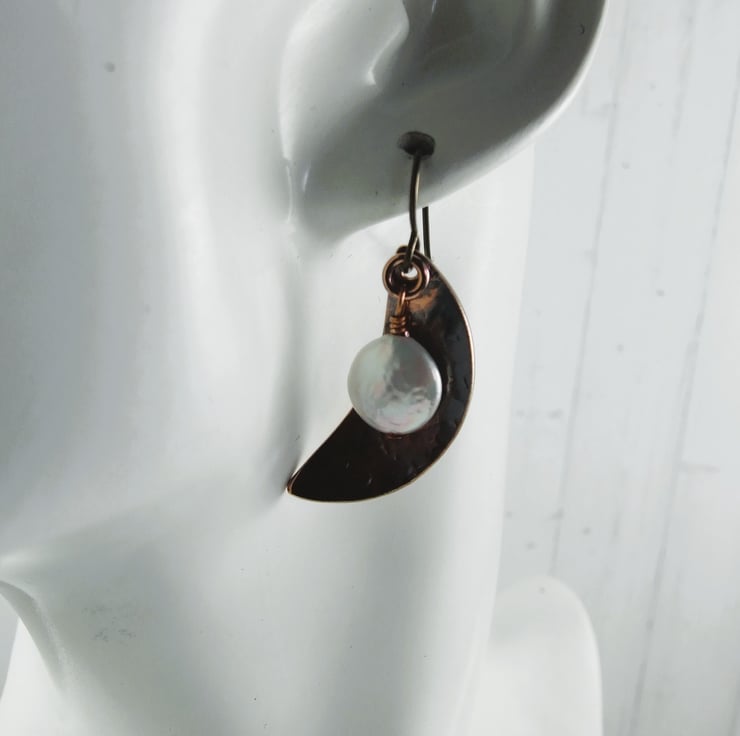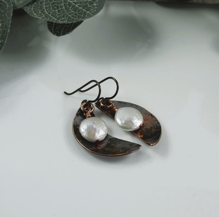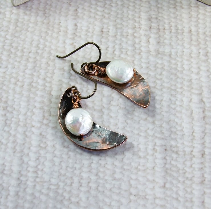 I have created the moon shapes from copper sheet, hand cut and textured with a star hammer. Alongside I have added some creamy coin pearls securely wire wrapped in place. Fitted to hypoallergenic niobium ear hooks.