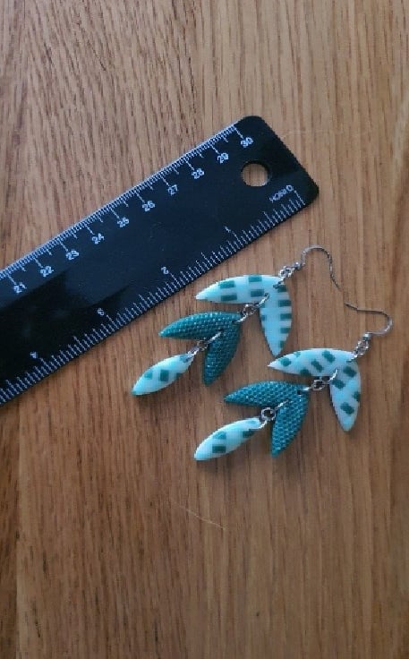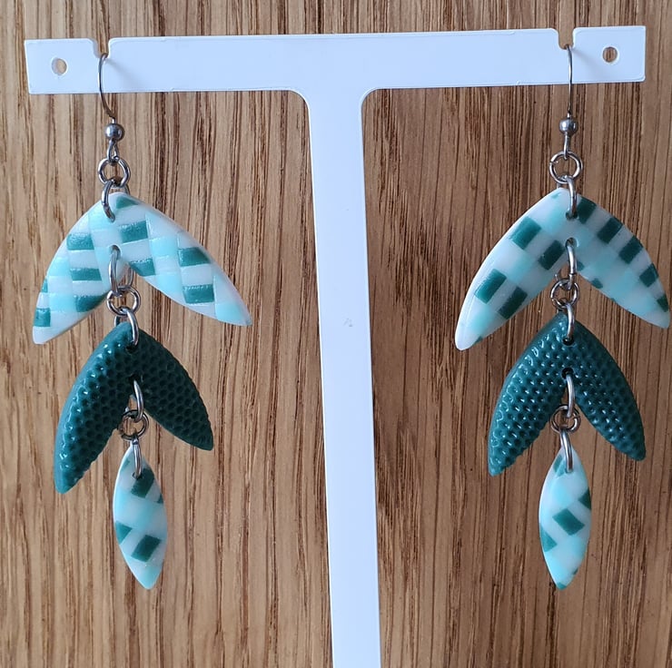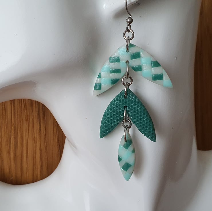 Dangle Three Section Leaf Shaped Earrings in Teal, Green and Blue Gingham Design