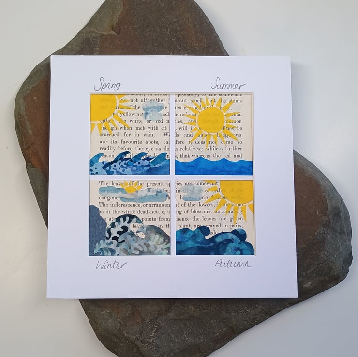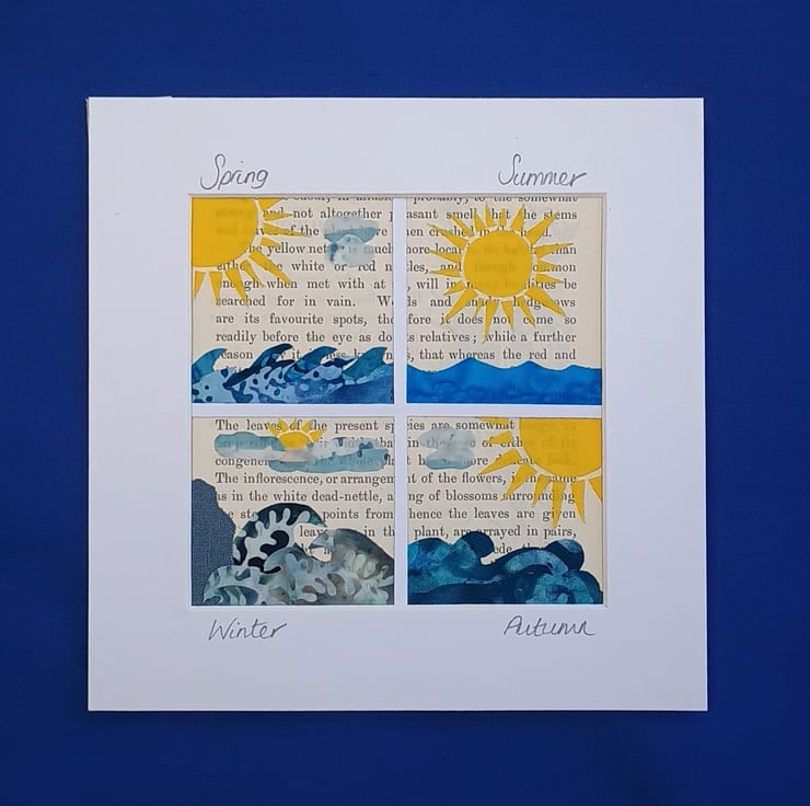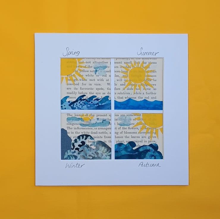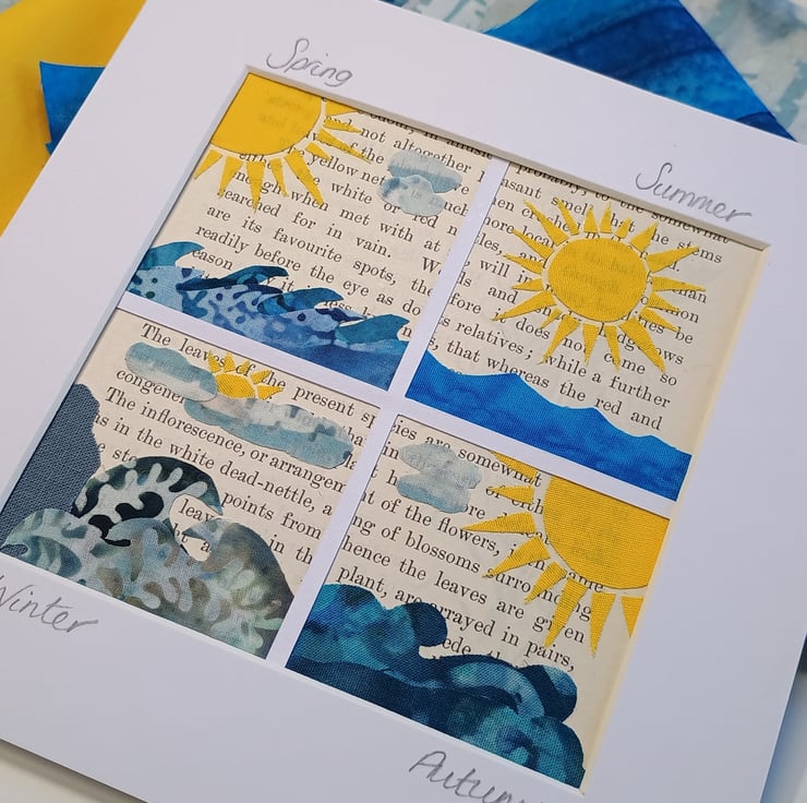 A collage of altering seascapes travelling through each changing season of the year. Crafted from vintage paper, batik and cotton fabrics onto white backing card and finished with a white picture mount. Handmade and unique, the picture is ready for your own frame.