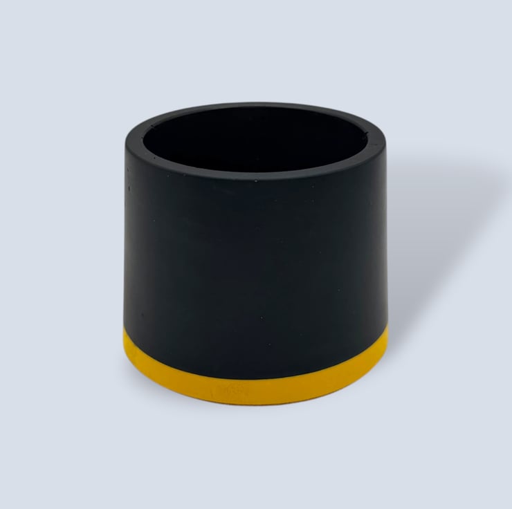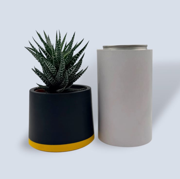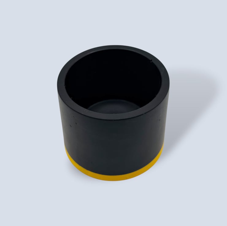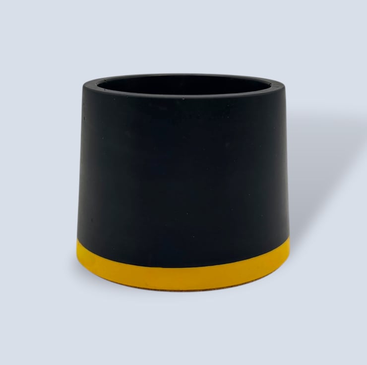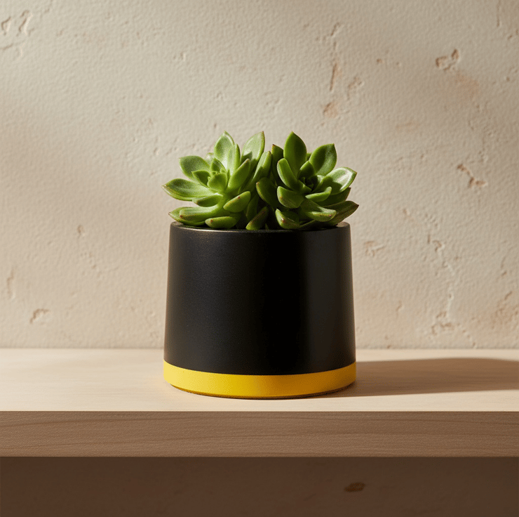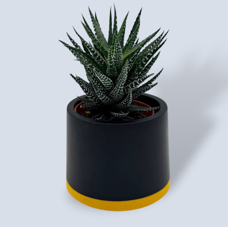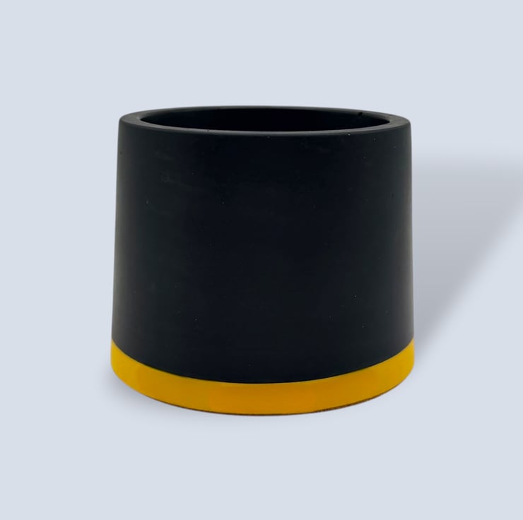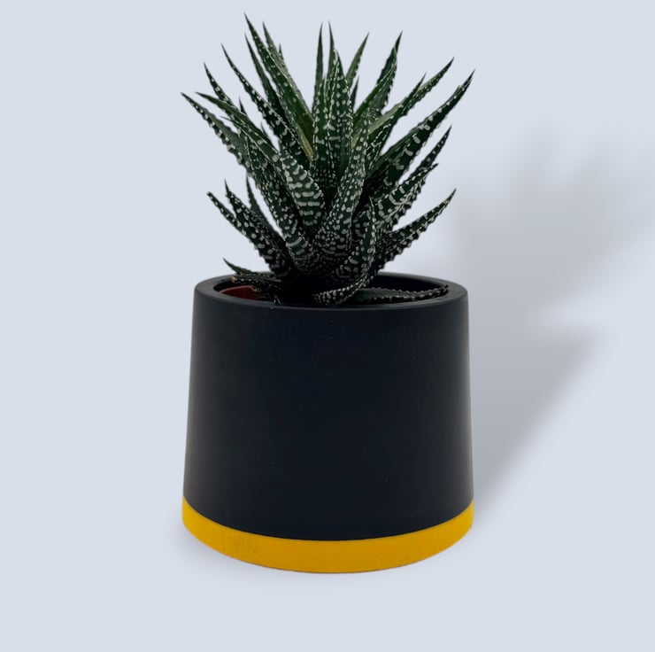 7.5 cm round black and yellow indoor plant pot for small houseplants, succulents and cuttings. This compact two-tone planter features a black body with a bright yellow band around the base, creating a bold yet balanced look that adds a pop of colour to desks, shelves and windowsills. A lovely gift for plant lovers, housewarmings or birthdays.