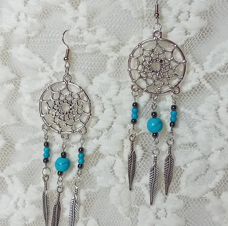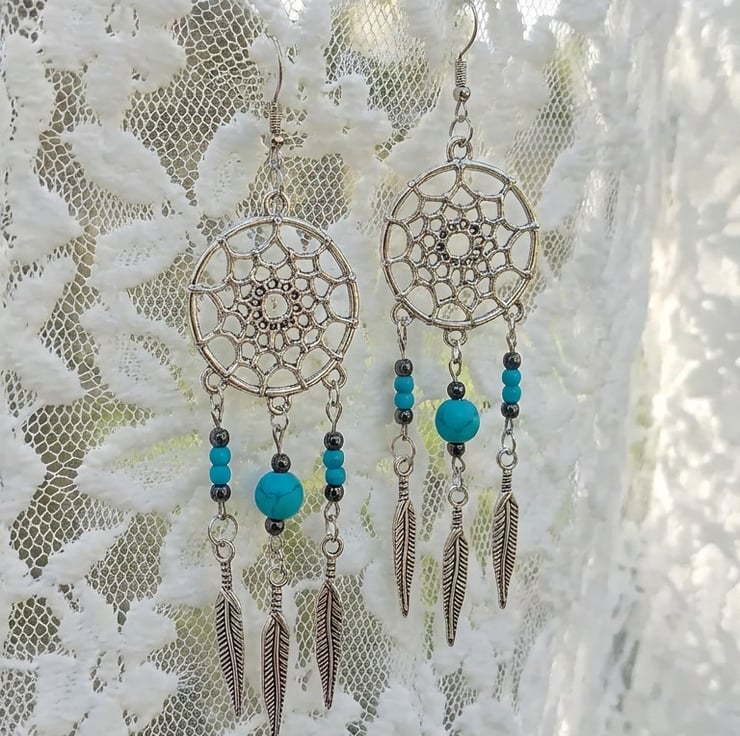 Stainless Steel hooks suspend these tribal, bohemian earrings. Measuring in total a length of 8cm. Each dream catcher earring has 5 genuine Turquois gemstones and 6 Black Agate gemstones with 3 feather charms. Your choice of lever backs or fish hooks.
