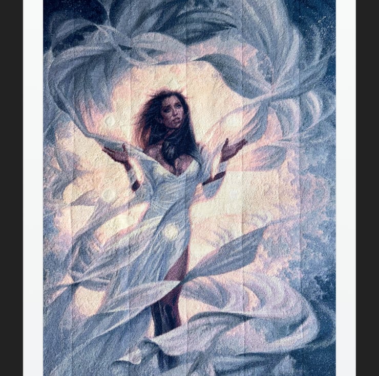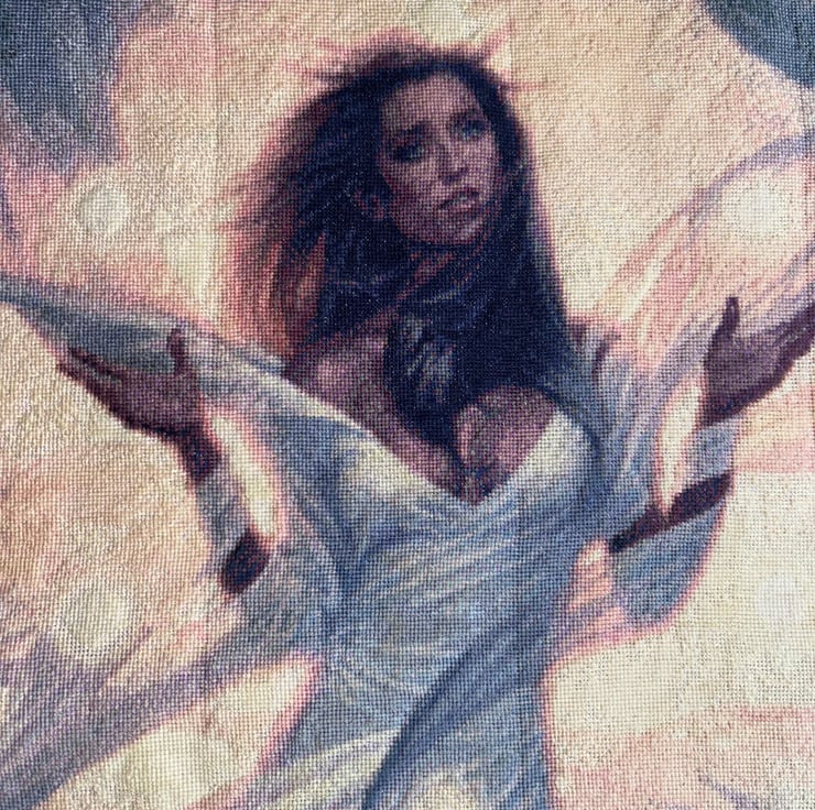This hand-stitched artwork is a striking, dreamlike piece that captures a beautiful woman surrounded by swirling, luminous movement, as though she is stepping into a world made of light, air, and quiet magic.