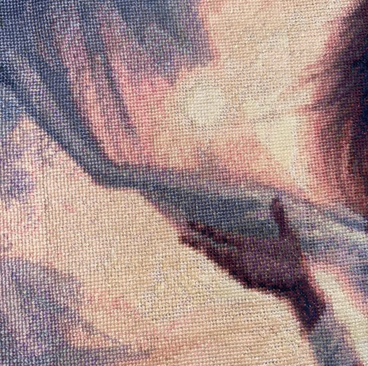 Every detail has been stitched with love and care: the delicate folds of her dress, the gentle curves of the drifting shapes around her and the glowing contrast between light and shadow.