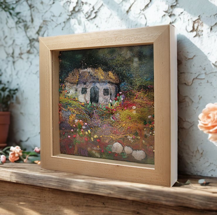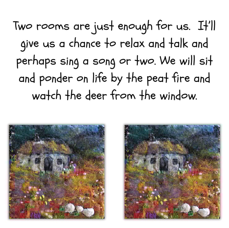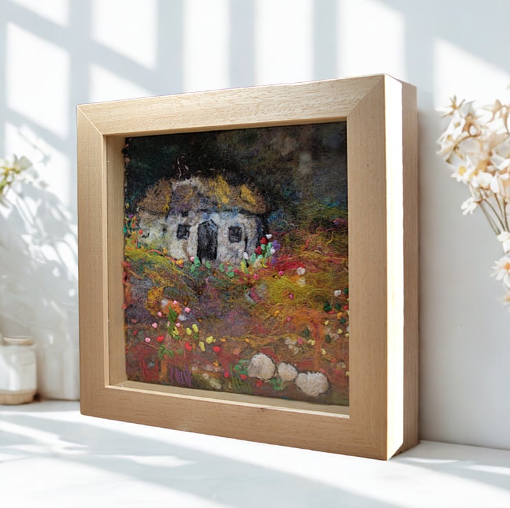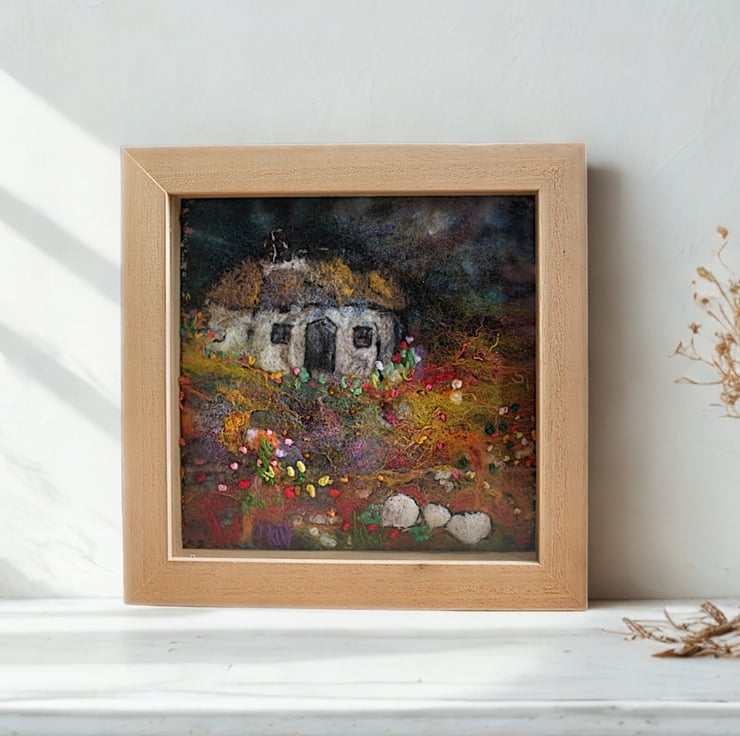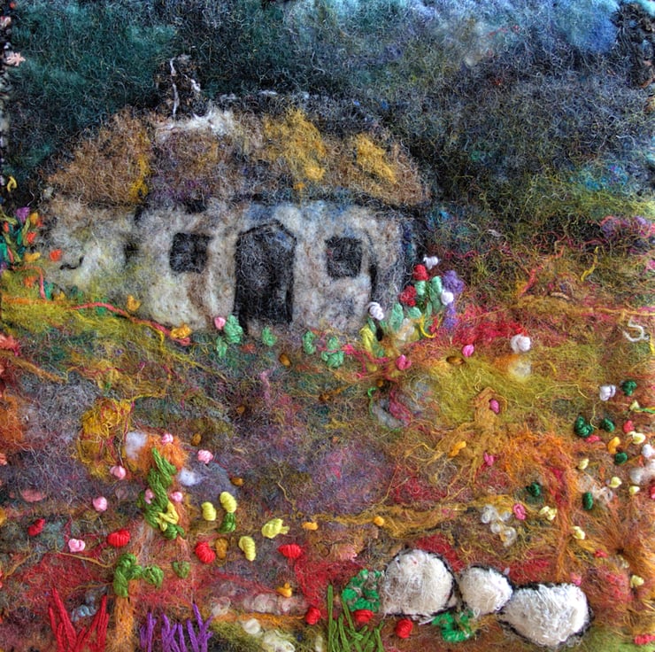 This is an original felt and stitch piece completed by hand. It features a small white but 'n' ben (small cottage) surrounded by wildflowers. I have used a variety of felting techniques and stitches to create a sense of rugged beauty just as the light fades from the skies.