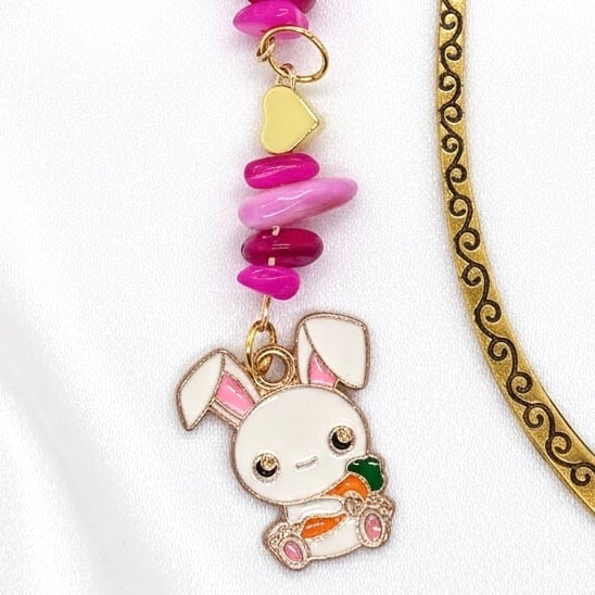 This handmade book mark is the perfect gift for Easter, it has a gold Tibetan hook, and has gorgeous hot pink dyed shell chip beads a gold plated heart in the centre and a cute gold plate enamel Easter Bunny Charm, will be sent to you wrapped in tissue and a pretty organza gift bag.