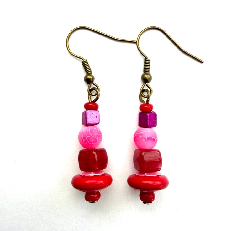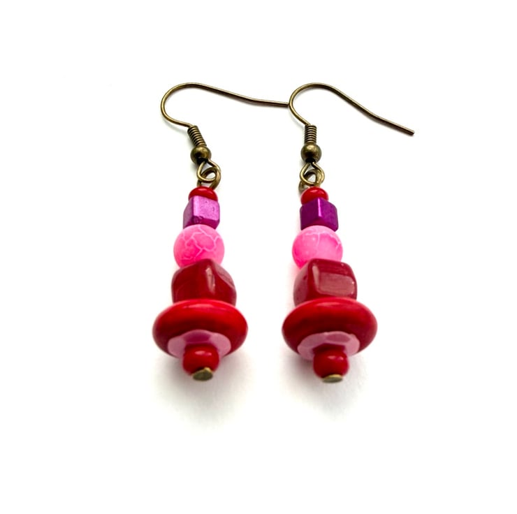 Red pink and purple drop dangle earrings handmade using up-cycled and shop brought beads.
