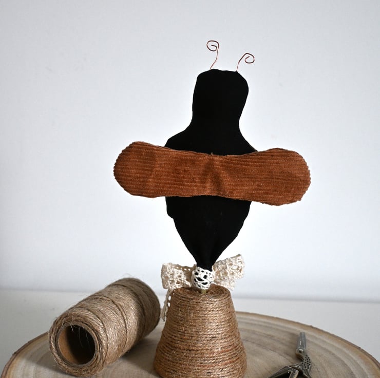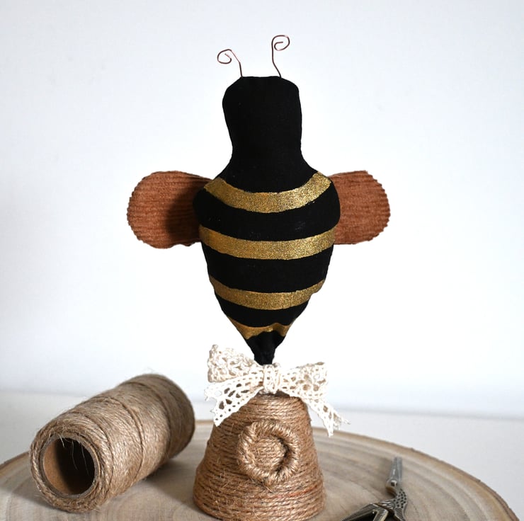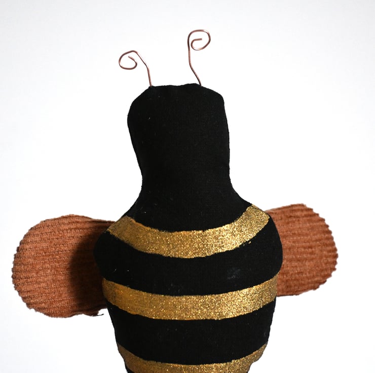 A bee which has been sewn and hand painted with gold stripes, it has brown corduroy wings and copper wire antenna.