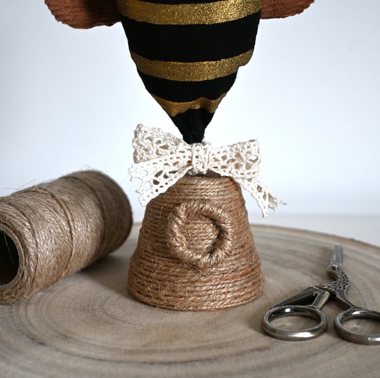 The bee stands on a twine bee hive and has a lace ribbon tied in a bow.