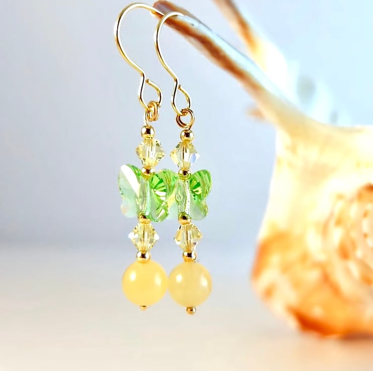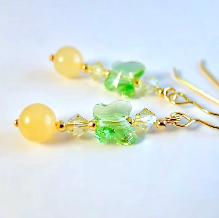 Bright and sparkly earrings featuring a 10mm apple green quality Austrian crystal butterfly in the colour 'peridot'.