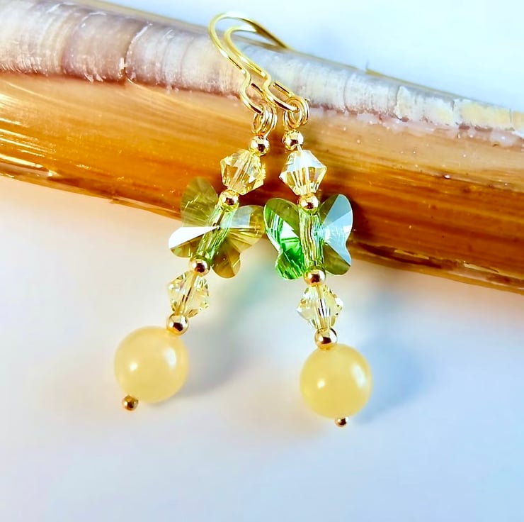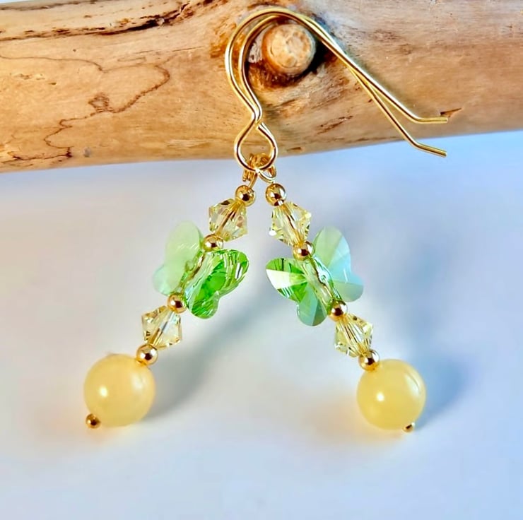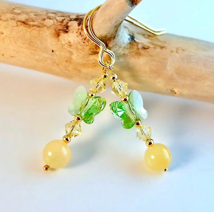 The butterflies are bracketed by 2mm gold vermeil beads and a pair of 4mm Austrian crystal bicones in the colour 'jonquil', and set above a 6mm Ambronite bead.
