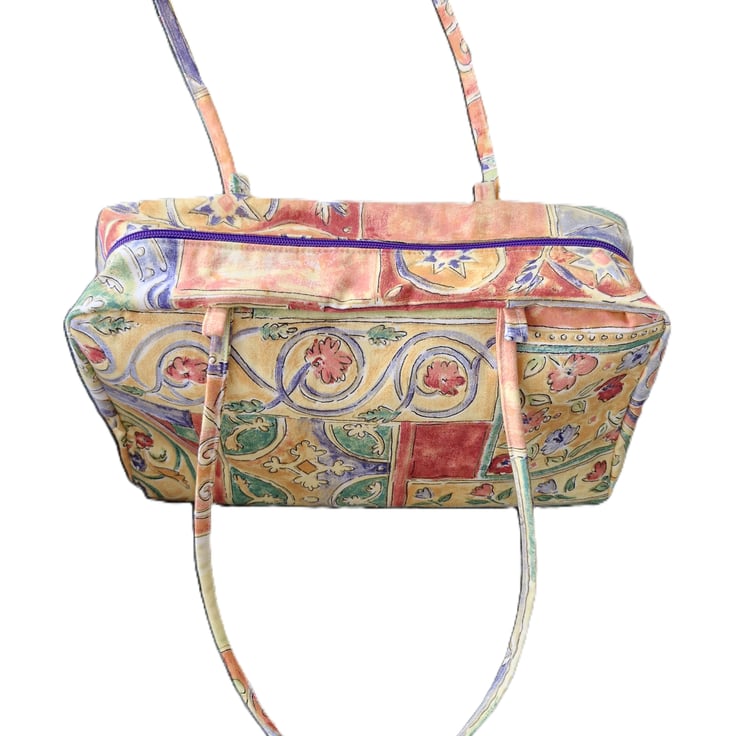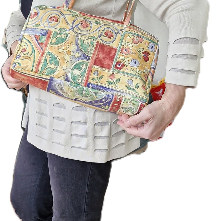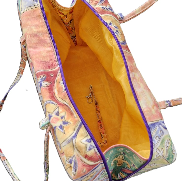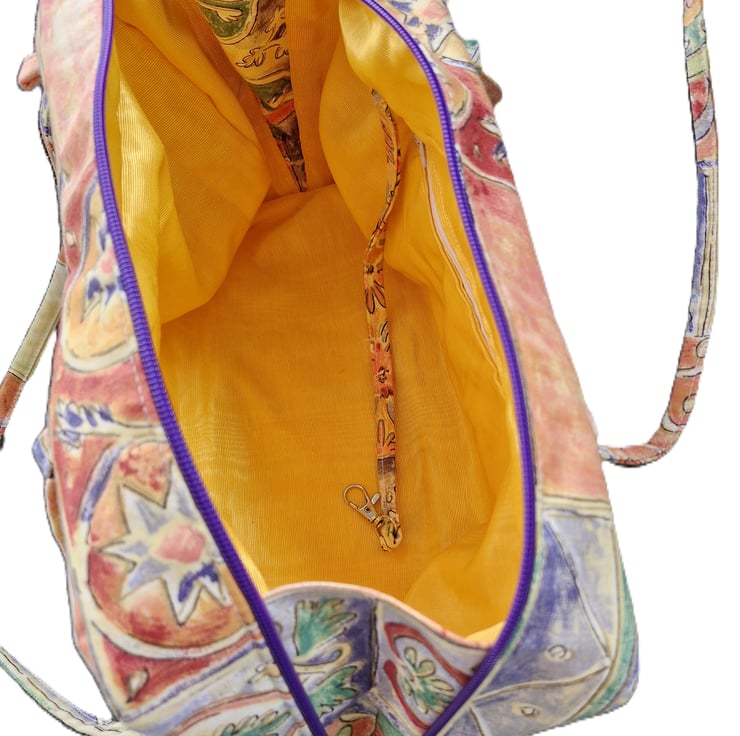 This bowling style bag is for you lovers of colour, with a multicolour patchwork look main fabric and a bright sunshine yellow waterfall faux silk interior.