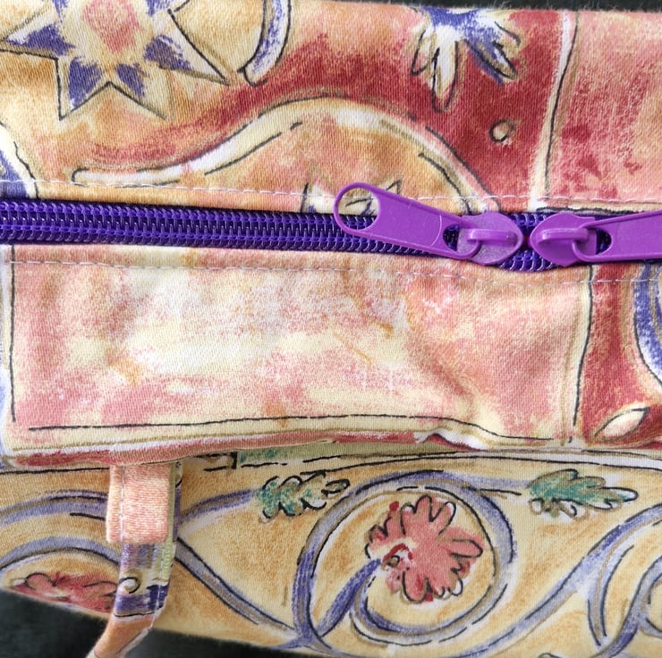 The double pull purple zip opens all around the top and sides past the side gusset to make it a roomy bag.