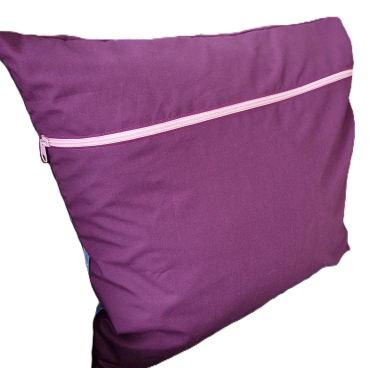 It has a pink nylon zip at the back to enable you to take the cover off to wash it.