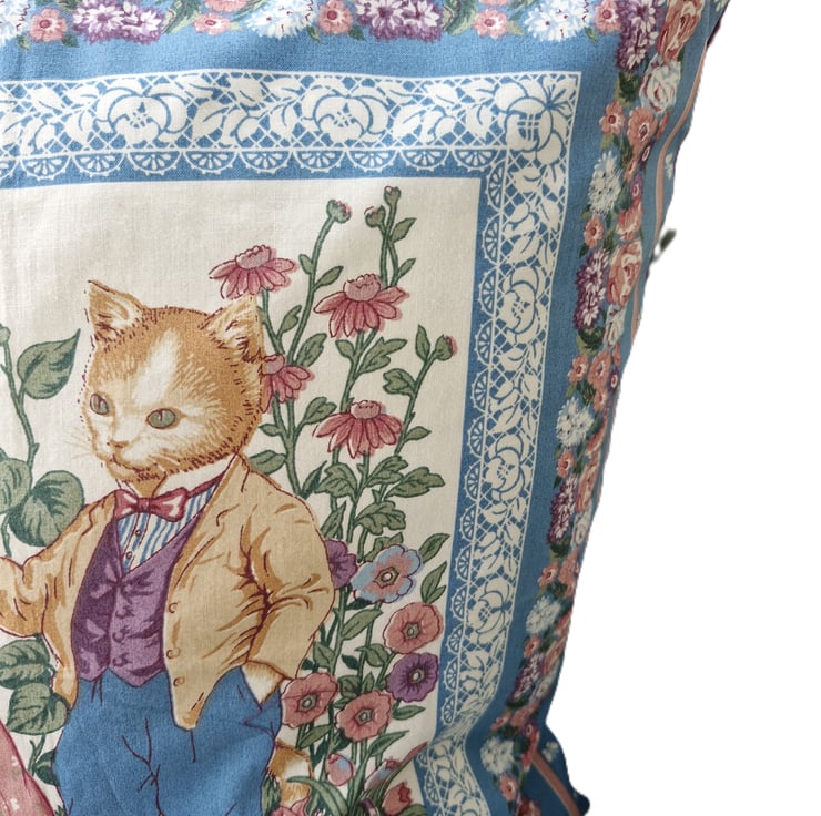 This cushion has been created using a kitsch cat design panel attached to a coordinating purple fabric to create a cushion.
