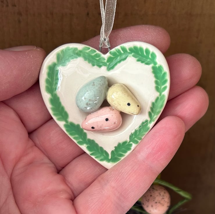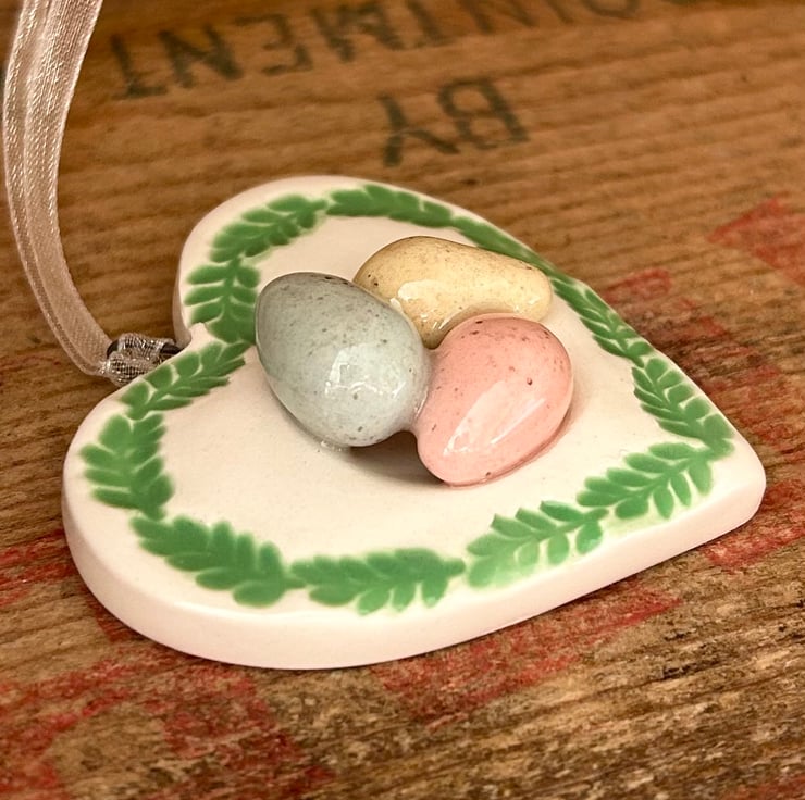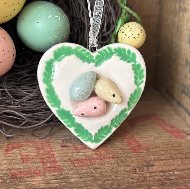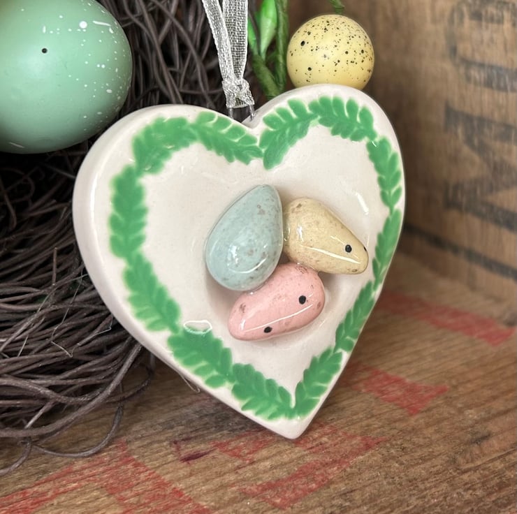 This ceramic Easter heart decoration is made from white earthenware clay and imprinted with a hollow nest, filled with 3 pastel coloured, spotty eggs! This has been fired in an electric pottery kiln, so it is nice and strong. It measures 5cm x 4.5cm x 1cm deep and hangs from a matching cream organza ribbon. It is glazed on the front and left plain on the back.