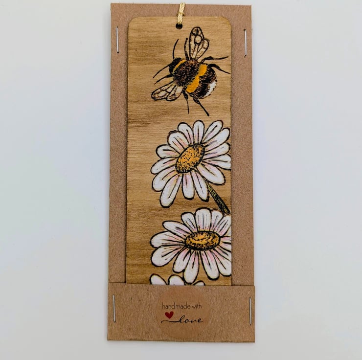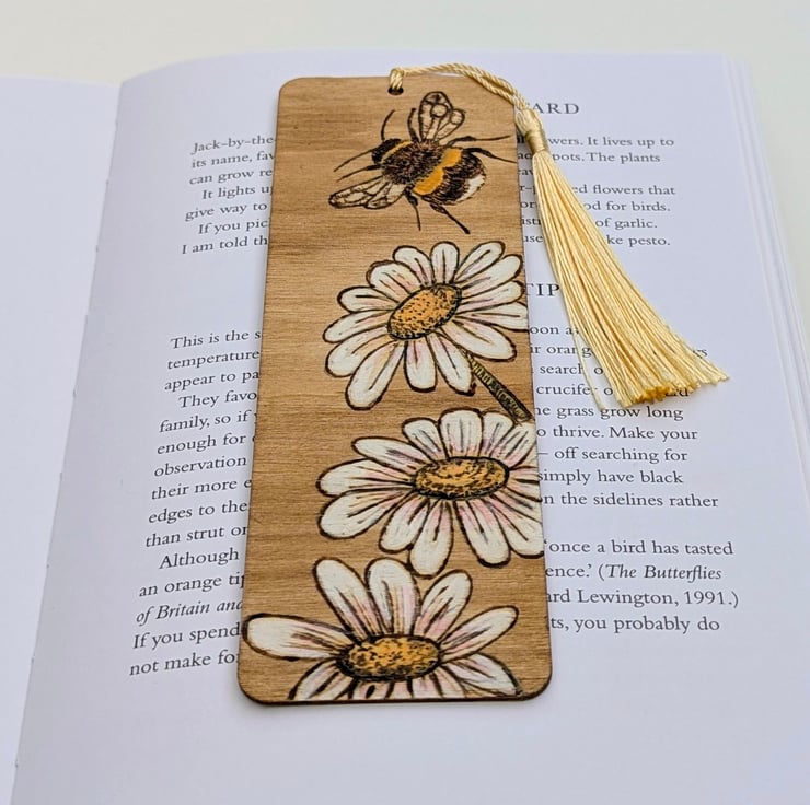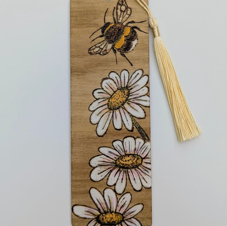 Bumblebee and daisies wooden bookmark which has been lovingly hand burnt using the art of pyrography. The bee and flowers design has been given a small pop of colour using acrylic paints. The bookmark has been stained with a light oak colour given several coats of varnish and finished with a matching pale yellow tassel.