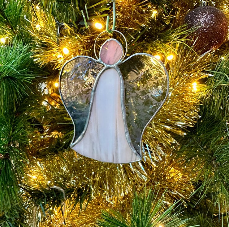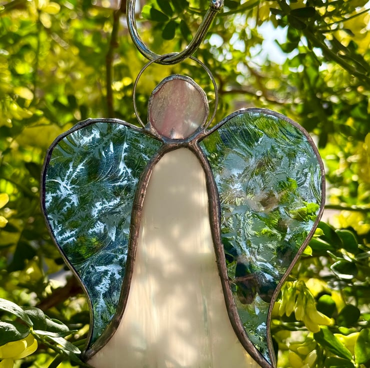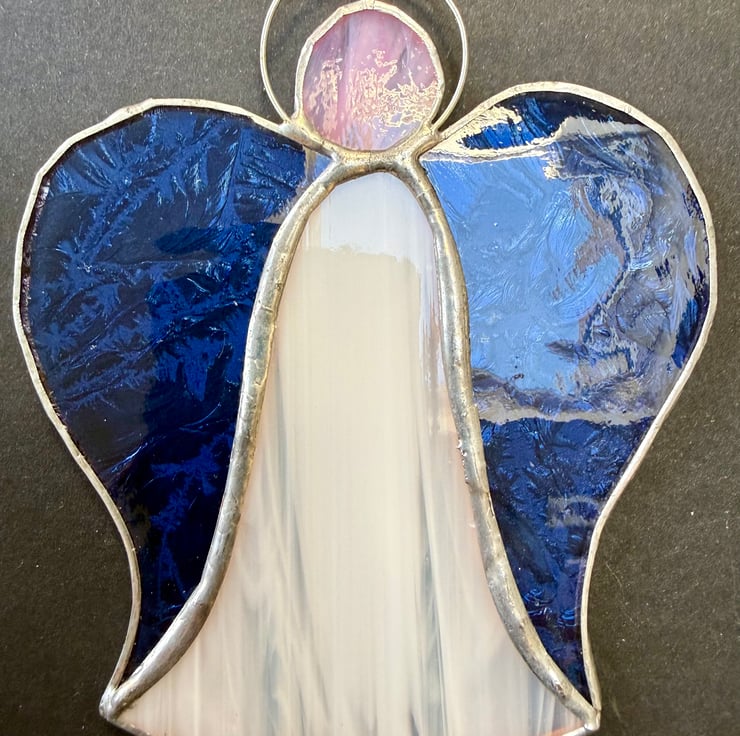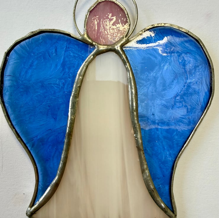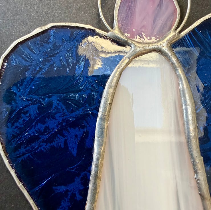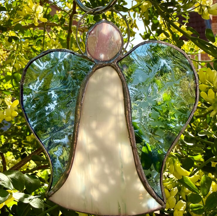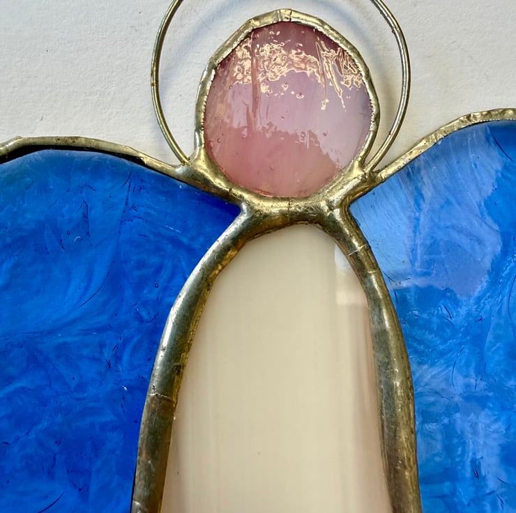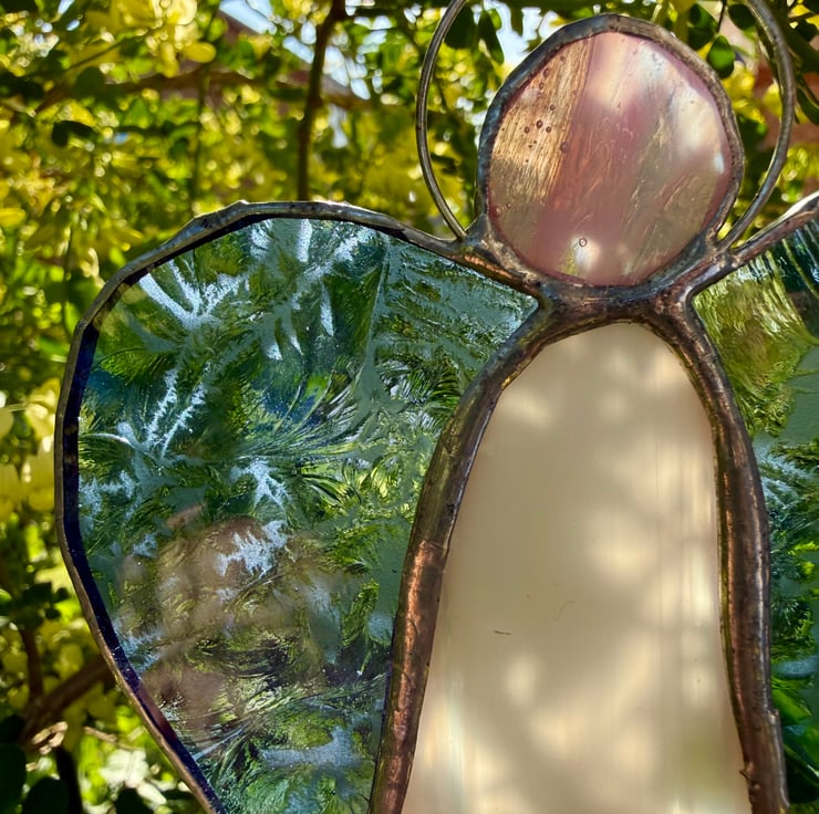 Each angel is individually hand cut and crafted using the Tiffany copper foil method. Every piece of glass is wrapped, soldered, cleaned and polished with care. As with all craft glass, natural variations and tiny character marks make each angel completely unique. Colours are shown as faithfully as possible in the photographs.