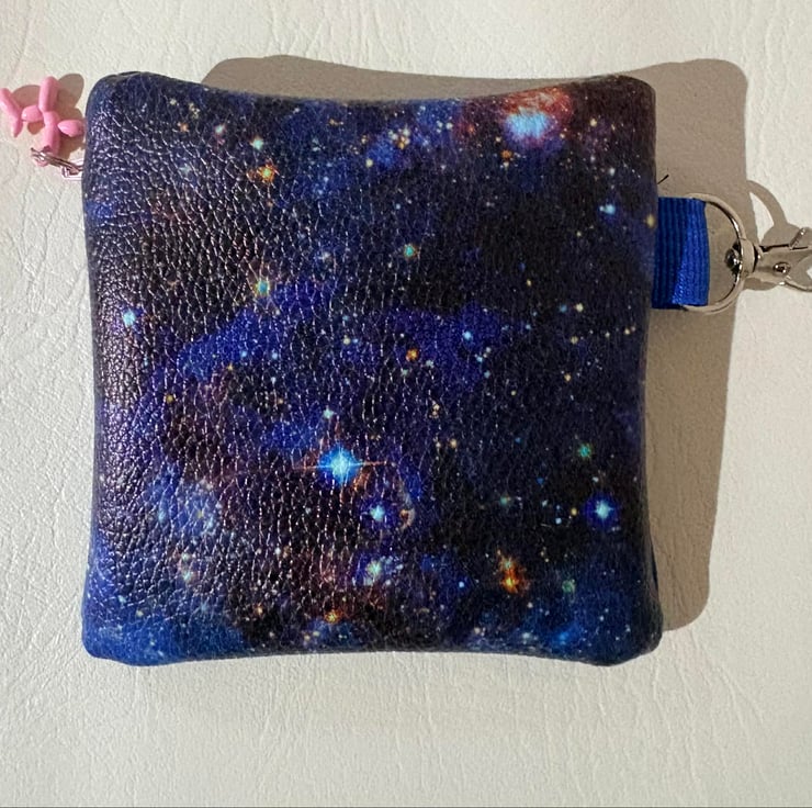 Handmade, embroidered small bag to fit a roll of poo bags, clips onto your dog’s harness, some leads or your belt strap. Bags dispenses through the hole.