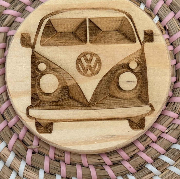 Bring a touch of wanderlust to your home with this handmade wooden coaster. Each 10cm round piece features a crisp, laser-engraved camper van design, with unique wood grain for rustic charm. Perfect for mugs, glasses, and tumblers, it protects surfaces from heat, moisture, and spills. A thoughtful gift for van-lifers, travel lovers, and adventure seekers, it’s stylish, practical, and full of character—ideal for everyday use or gifting.