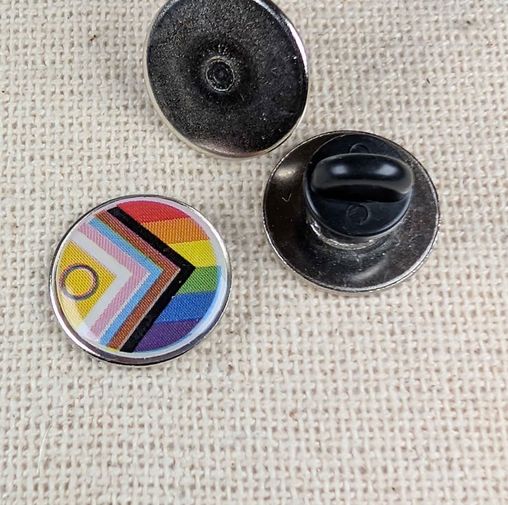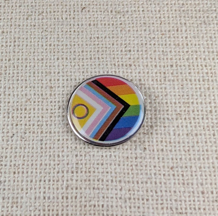 Celebrate inclusivity, visibility, and modern LGBTQ pride with this bold Progress Flag Pin (18mm). Featuring the updated Progress Pride design, it combines the classic rainbow stripes with a chevron of black, brown, pink, blue, and white—representing marginalised LGBTQ communities, people of colour, and transgender individuals. The design is sealed beneath a smooth, glossy resin finish that enhances the vibrant colours while adding depth and durability. Compact yet meaningful, it’s perfect for jackets, bags, hats, lanyards, or your pin collection.