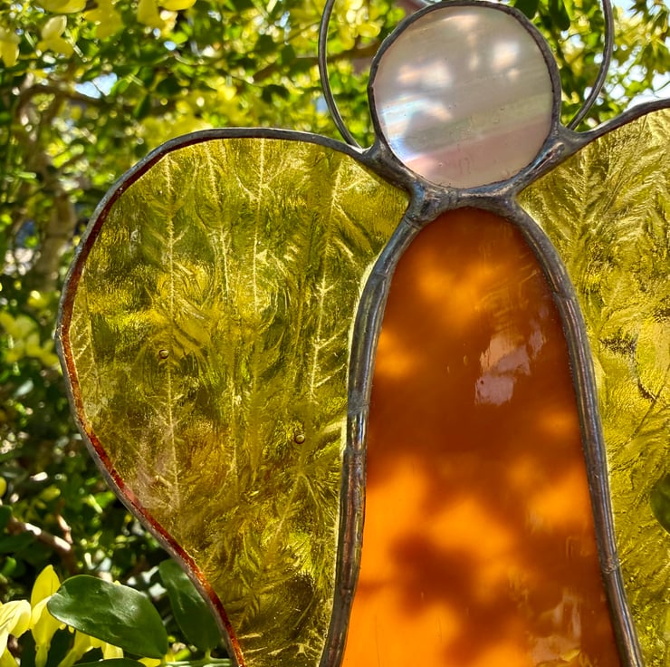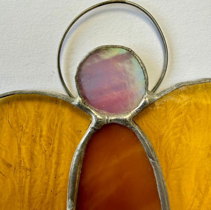 This angel features a body made from opaque burnt orange glass, with natural waves and variations that give it a warm, earthy depth. Her wings are crafted from yellow gluechip glass, whose frosted, feathery texture catches the light beautifully. She is finished with an iridescent pink circular head — shimmering with subtle colour shifts — and a hand formed metal halo.