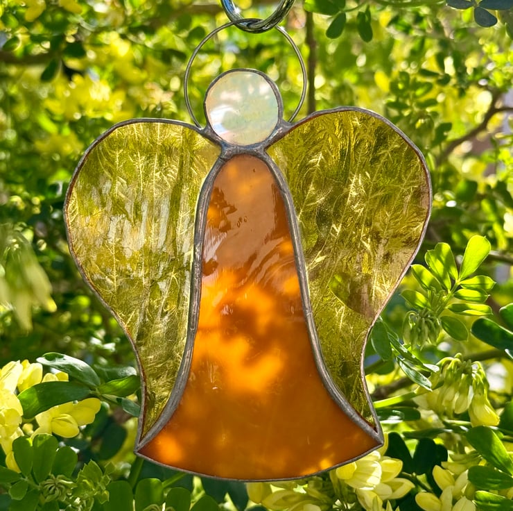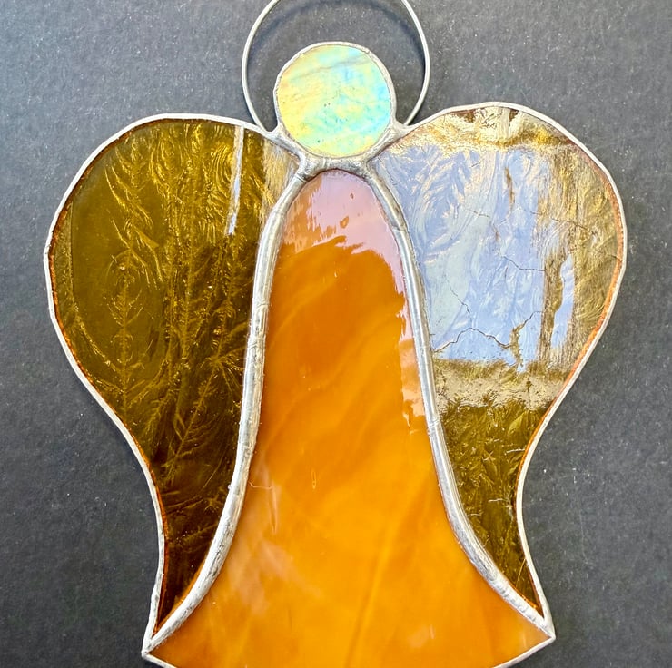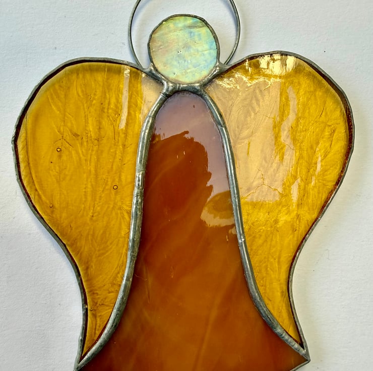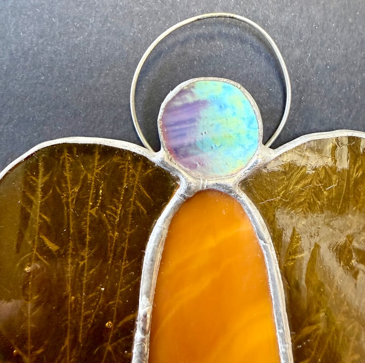 Each angel is individually hand cut and crafted using the Tiffany copper foil method. Every piece of glass is wrapped, soldered, cleaned and polished with care. As with all craft glass, natural variations and tiny character marks make each angel completely unique. Colours are shown as faithfully as possible in the photographs.