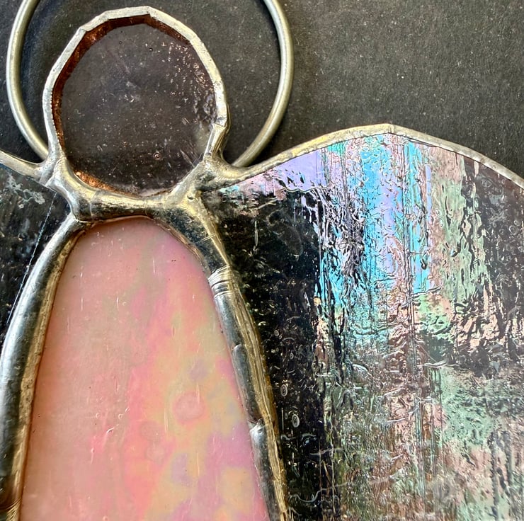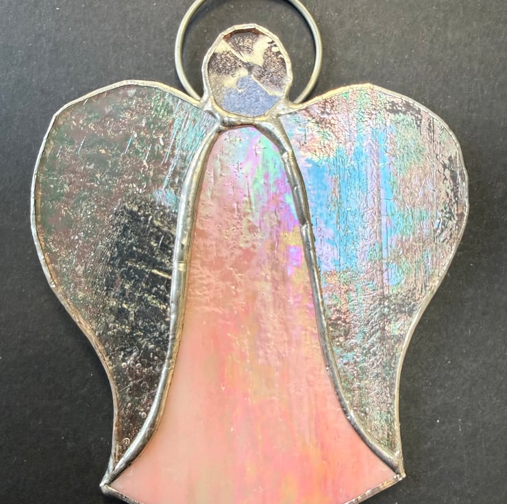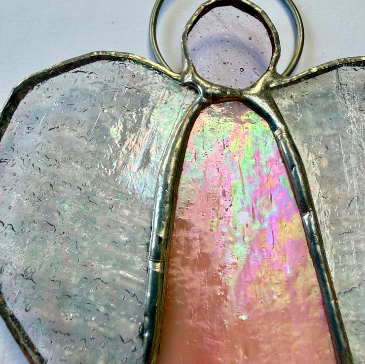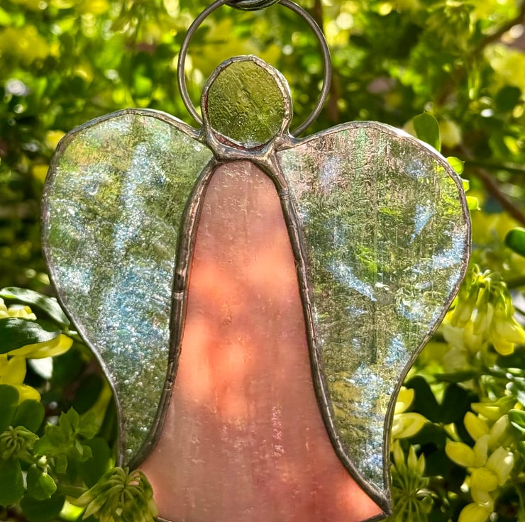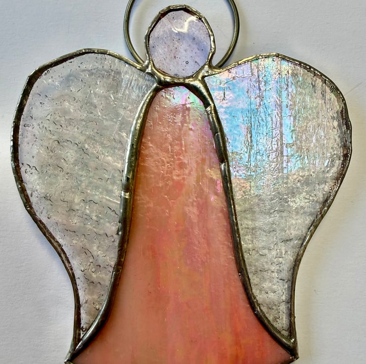 Each angel is individually hand cut and crafted using the Tiffany copper foil method. Every piece of glass is wrapped, soldered, cleaned and polished with care. As with all craft glass, natural variations and tiny character marks make each angel completely unique. Colours are shown as faithfully as possible in the photographs.