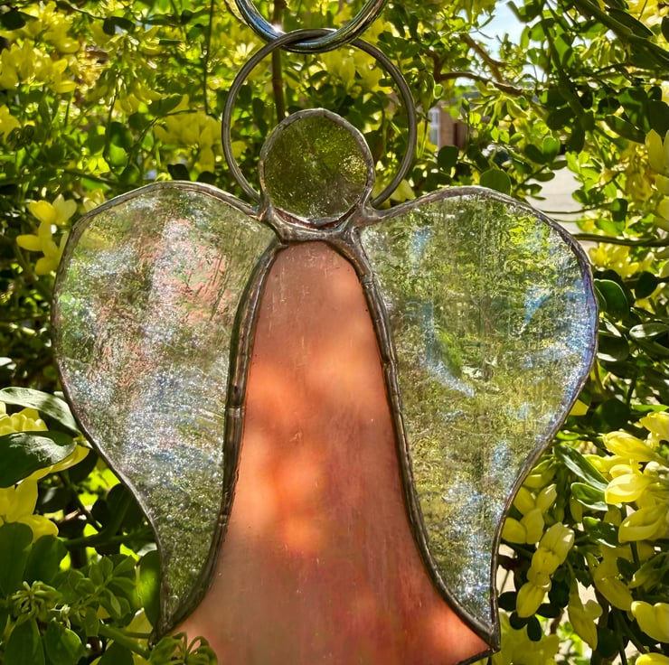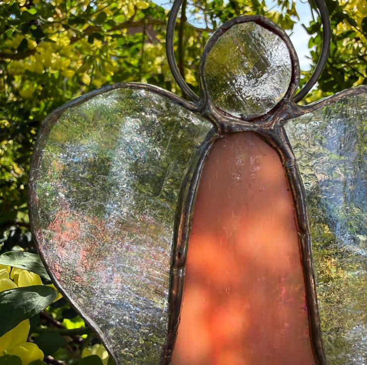 This angel features a body made from opaque iridised orangey glass, glowing with the warm, shifting colours of a sunset. Her wings are crafted from clear iridised textured glass, catching the light with a soft shimmer and adding a sense of delicate movement. She is finished with a circular glass head that is principally clear with faint pink streaks, topped with a hand formed metal halo.