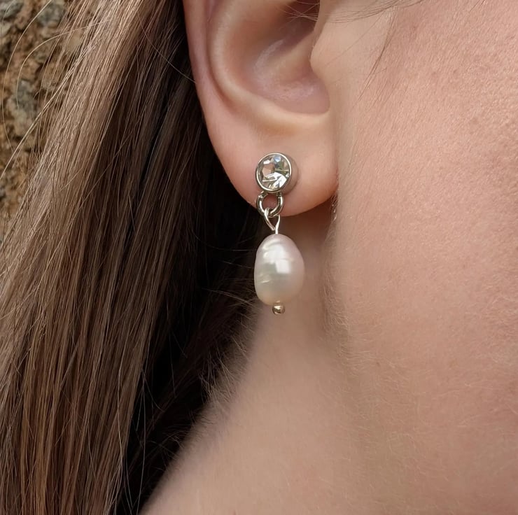 A pair of handmade earrings combining natural freshwater pearl drops with simple crystal studs.