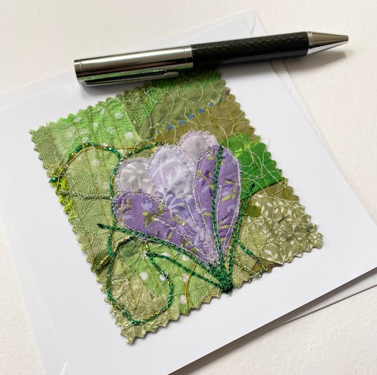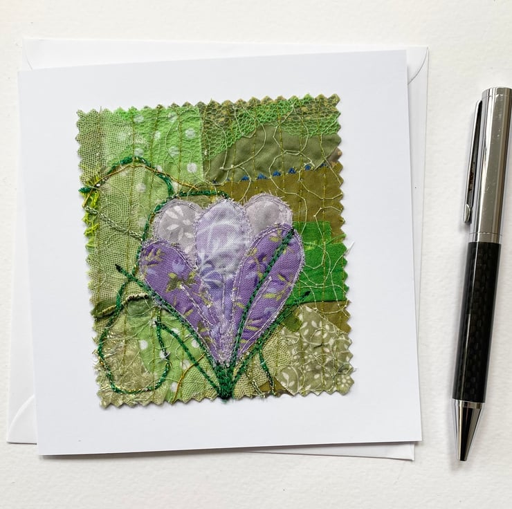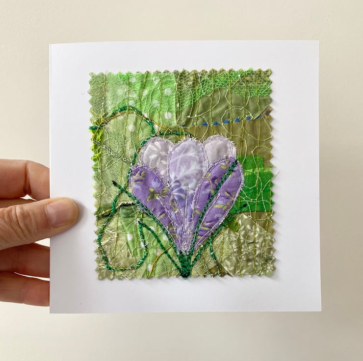 This cheerful embroidered little spring crocus card has been made with my own handmade up-cycled fabric and enhanced with free motion embroidery. It's perfect for a birthday, anniversary, Mothers Day or for someone very special. It is blank inside making it ideal for any occasion. This white card measures 14.5 x 14.5cm, comes with an envelop and in a plastic cover for protection.