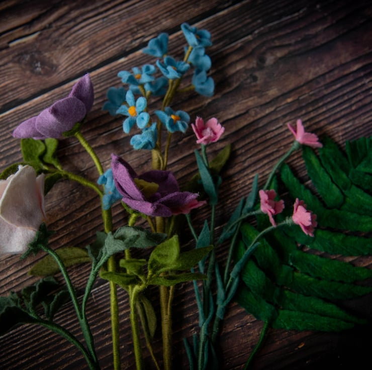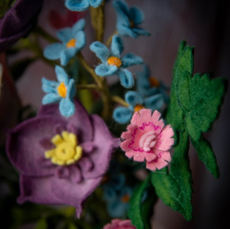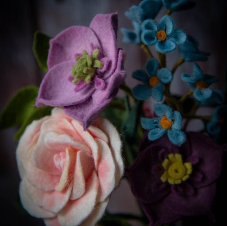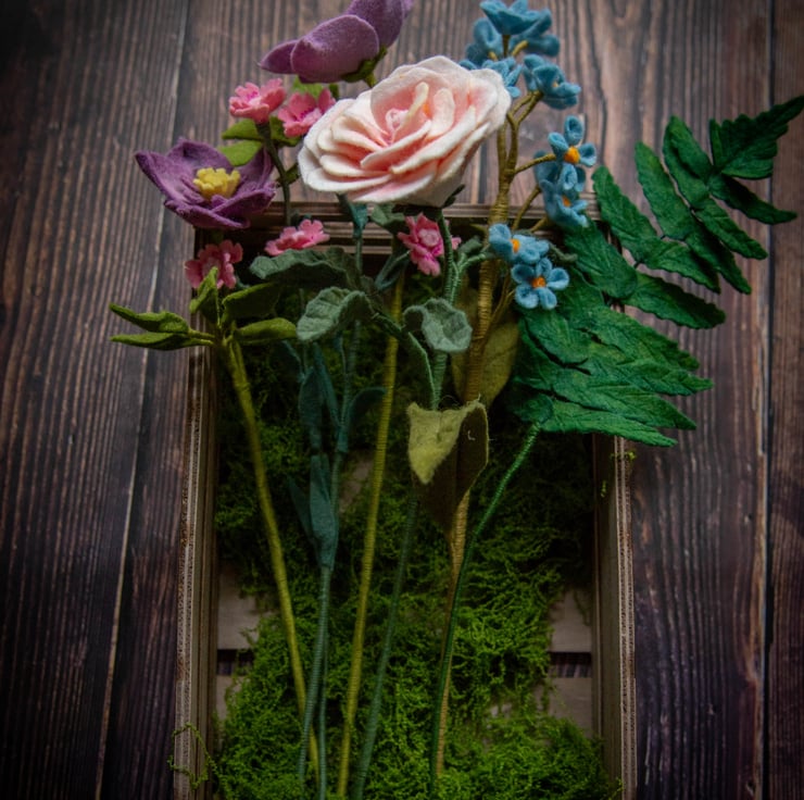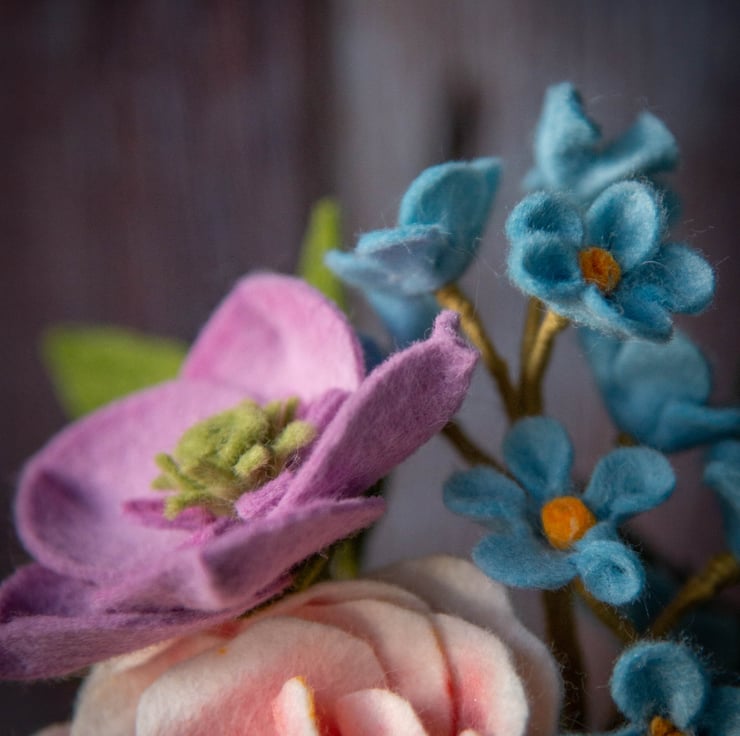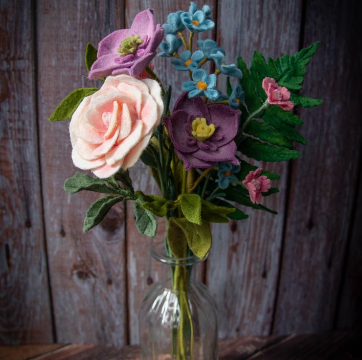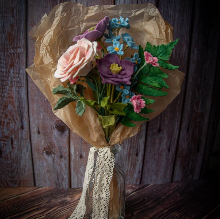 The name of this bouquet comes from its central flower - a gentle rose surrounded by forest blooms and fern. It is a colourful and fresh felt arrangement that (I hope) can bring joy to any person who enjoys romantic and whimsical decor. This bouquet makes a lovely addition to a table, desk or shelf, and it works beautifully as a thoughful gift gor almost any occasion, from birthdays to “get well soon” wishes. Can last decades if stored carefully (not exposed to bright sunlight and high humidity).