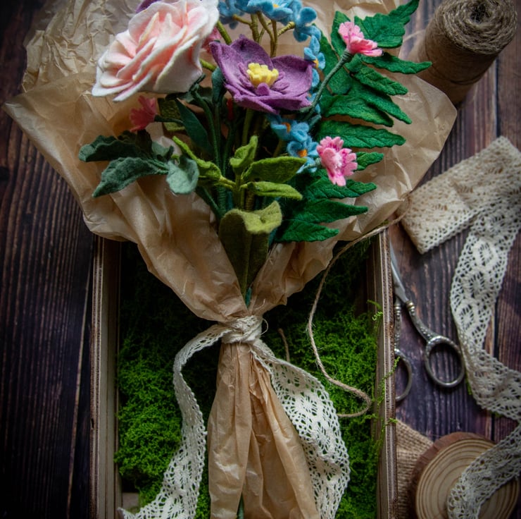 Each flower is cut by hand with very sharp scissors (except forget-me-not petals which are cut by Cricut machine), petals are lightly coloured with pan pastel and shaped with a mini iron. Every stem is individually wrapped with cotton yarn. All flowers are assembled with hot glue, care and precision. Your bouquet will arrive wrapped with tissue paper and lace ribbon (as pictured).