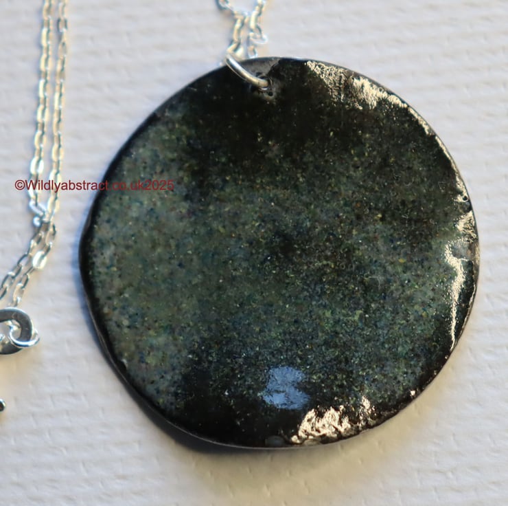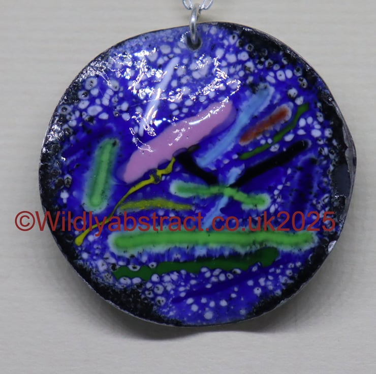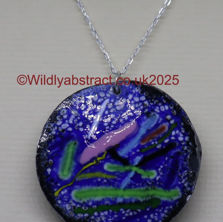This one of a kind pendant was hand-crafted from a recycled mild steel off-cut. The steel was prepared for enamelling with a coat of ground-coat which allows the enamel to adhere to it. It then had a further two layers of enamel applied and was fired in the kiln. The pendant is decorated with carefully placed enamel threads and re-fired in a design inspired by microscopic bacteria. It is counter-enamelled for a professional wearable finish. The pendant has a sterling silver trace chain. It measures 3cms x 3cms with a total length of 26cms.