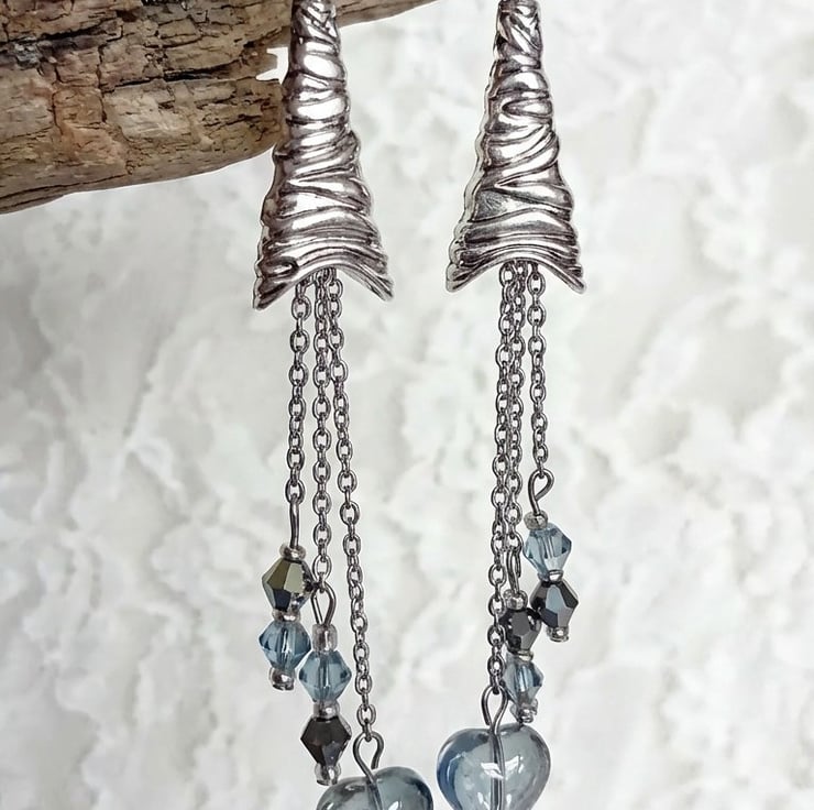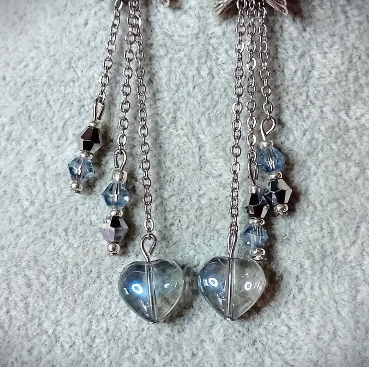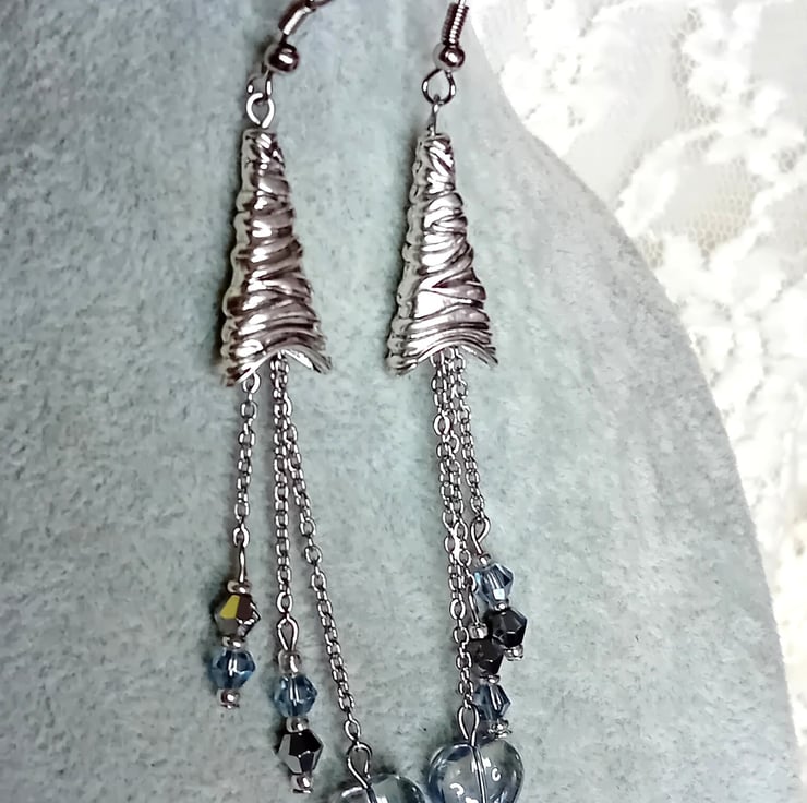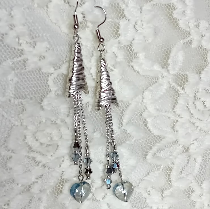 These earrings are a new design, made with Stainless Steel which is allergy/rust free. Each chain is accented with Glass beads of the palest Blue. Each chain is graduated in length, the longest supporting a puffed heard. Total drop of 3cm, these will not go unnoticed.