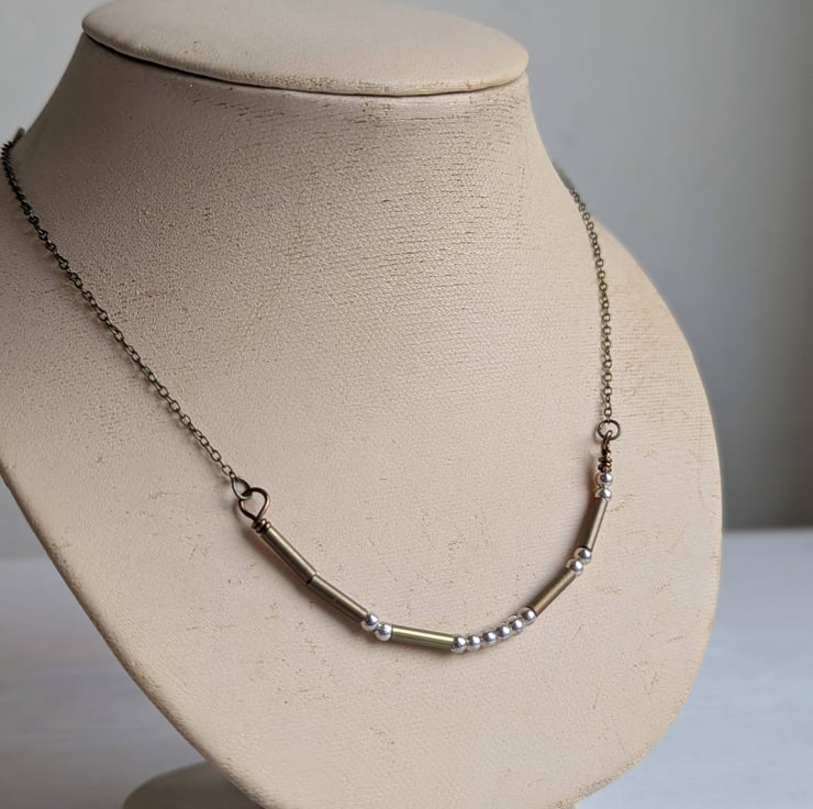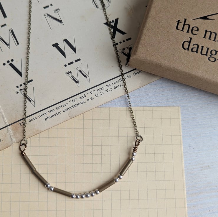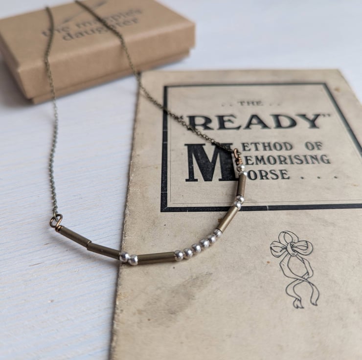 This necklace spells out 'mithered' in international Morse Code. Brass tube beads and pewter dots, placed on fine brass trace chain.