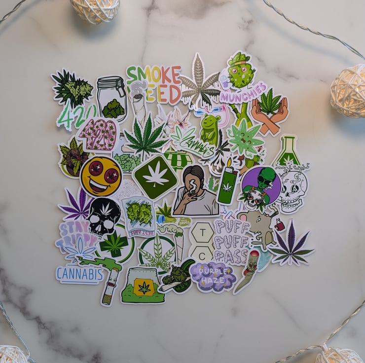 Choose from 25 or 50 high-quality vinyl stickers featuring a mix of stoner, marijuana, and aesthetic designs — perfect for adding personality to your everyday items.