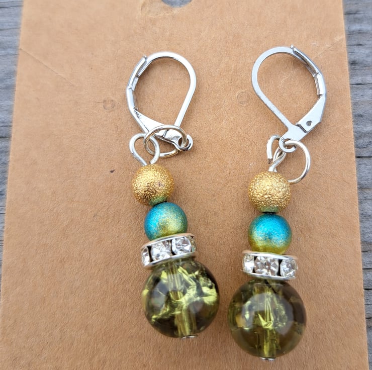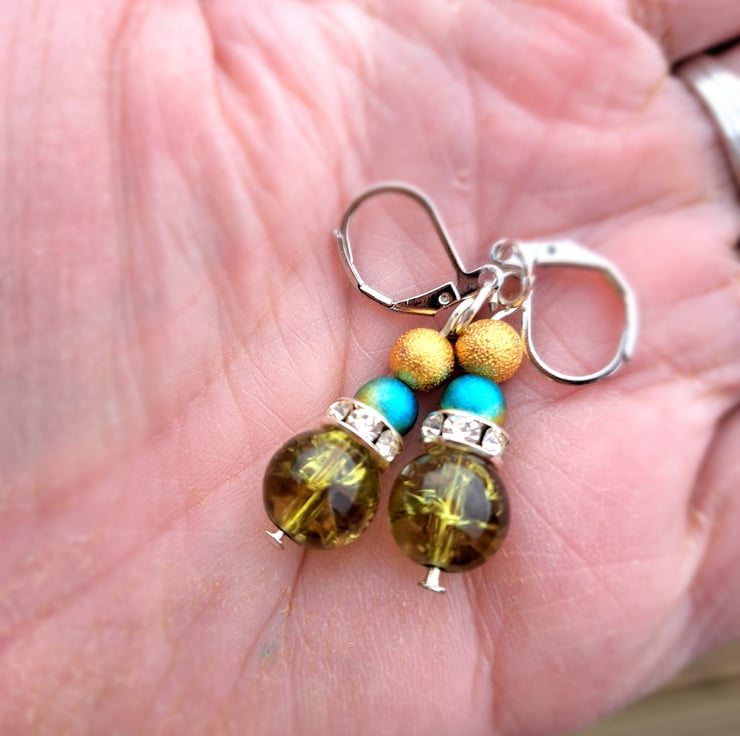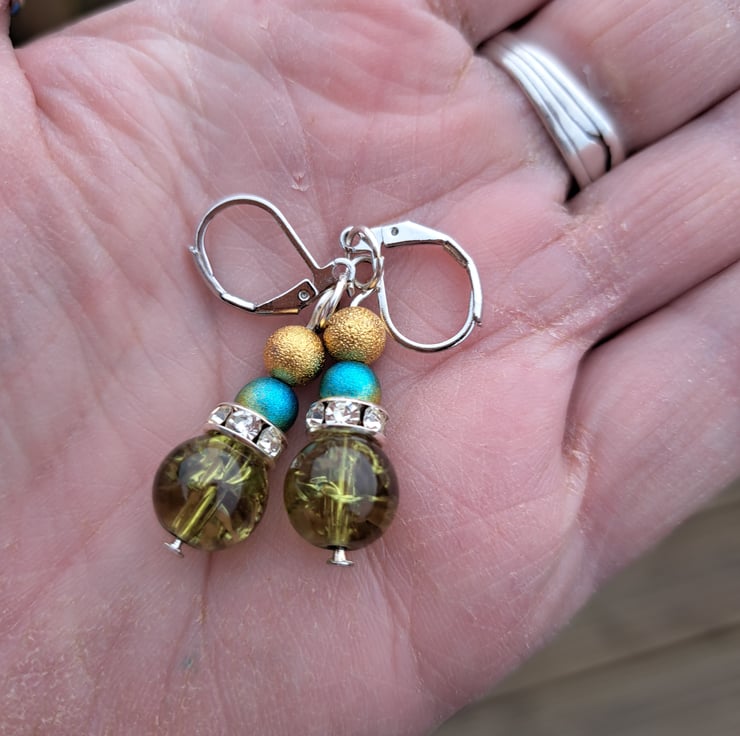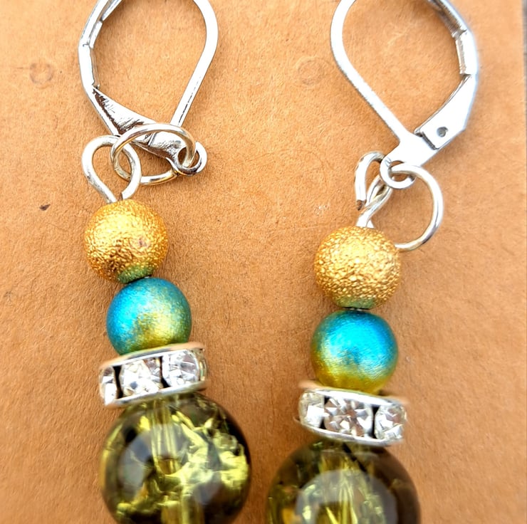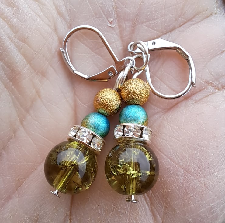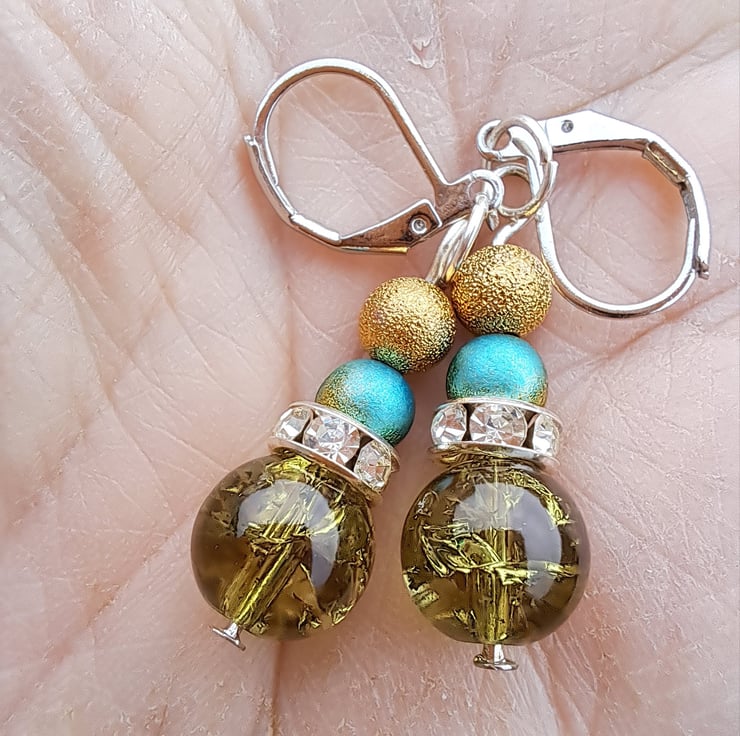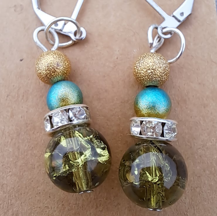 Gold, blue/gold, diamante spacer finished with a larger olive green crackle bead.