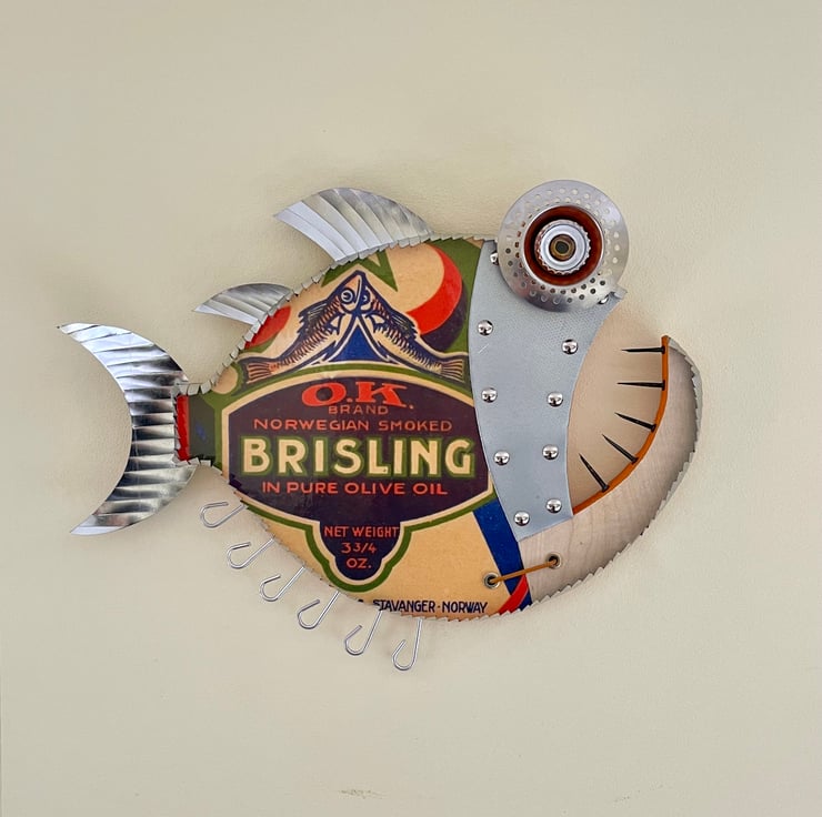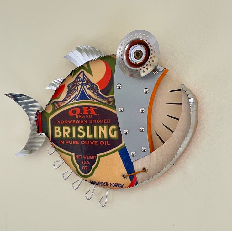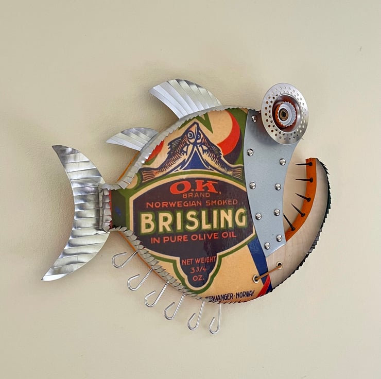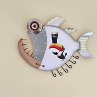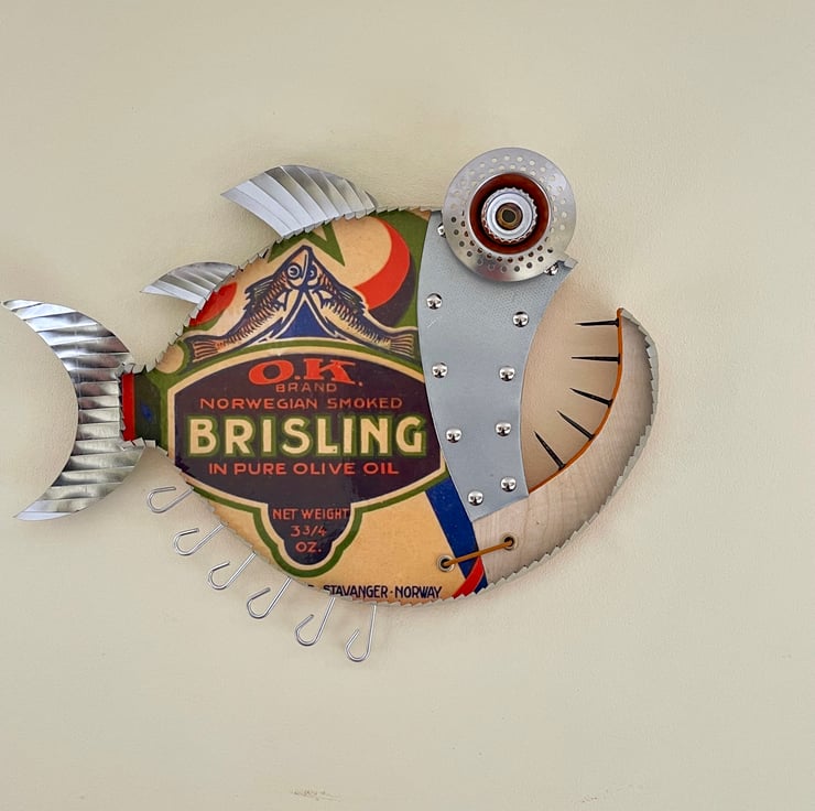 This fish has been hand made by myself from recycled wood , Metal, bottle tops, Aluminium rod, Cans and plenty of imagination with a Quirky Sardine theme.