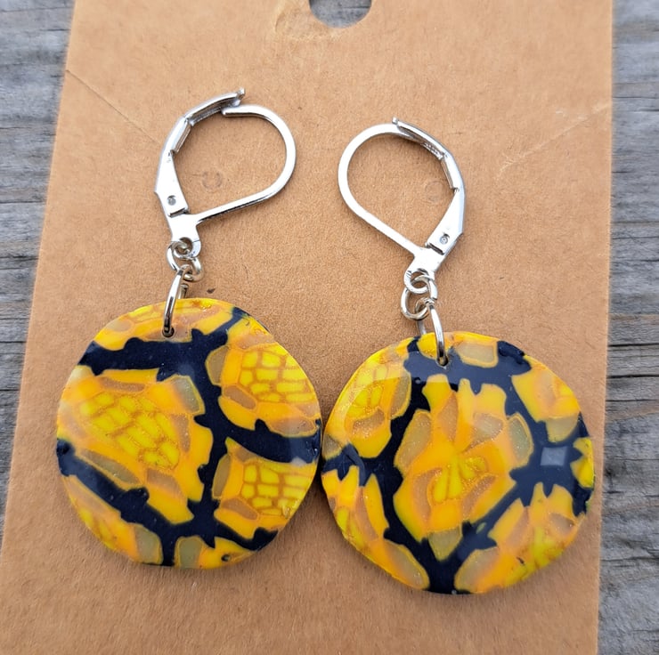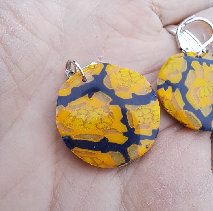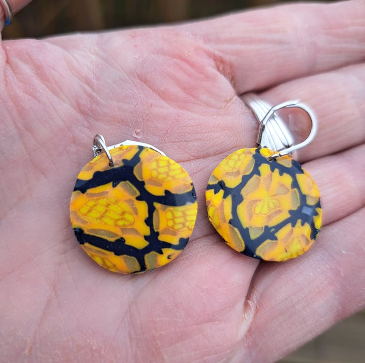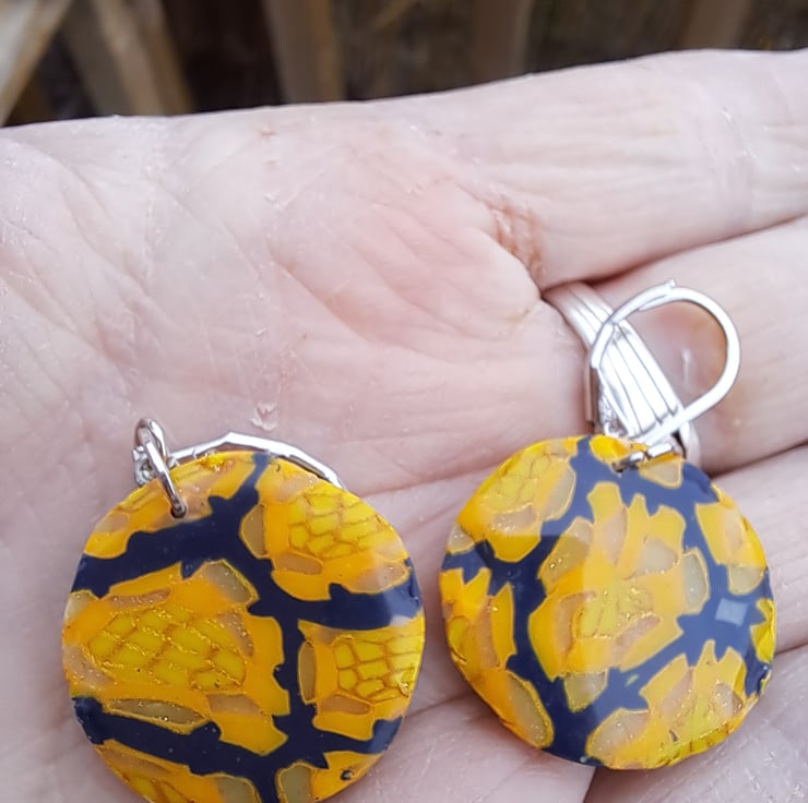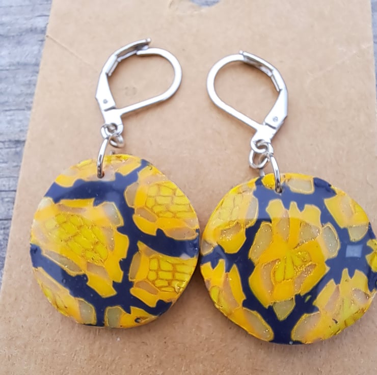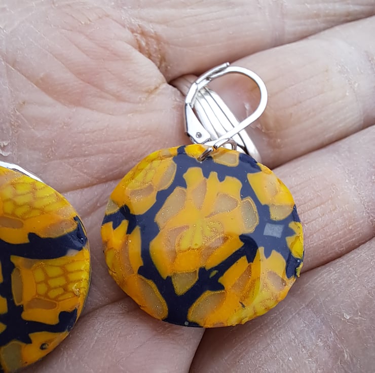 Each earring is made from scratch with a selection of colours, creating a sun flower cane that has been added to a blue background. Finished with a coat of resin.